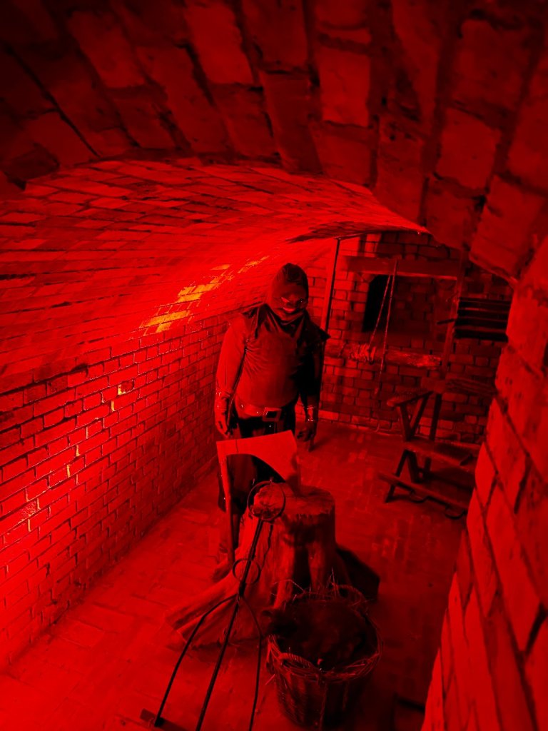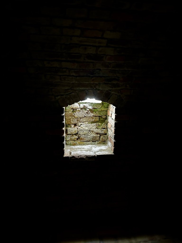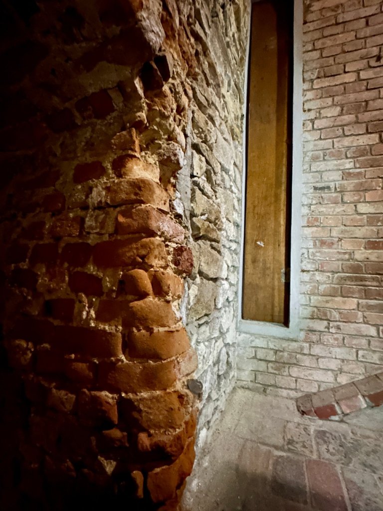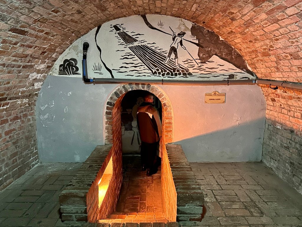 W jednym z nich zatrzymujemy się na moment, jest ciasno i ciemno. W szczelinach ścian wyraźnie widać jasnobrązowe lessowe wypełnienia, które mocno odcinają się od cegły.