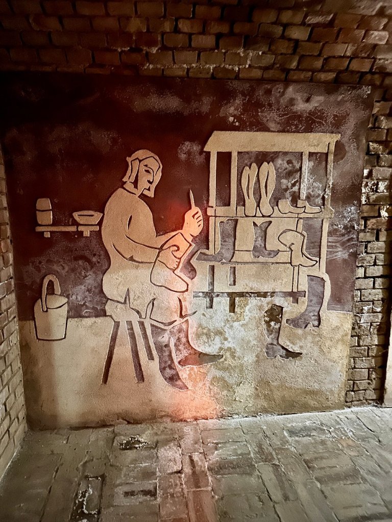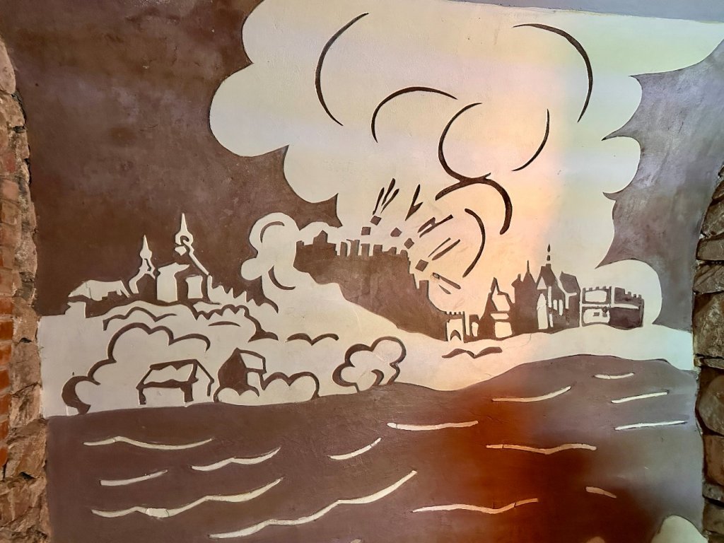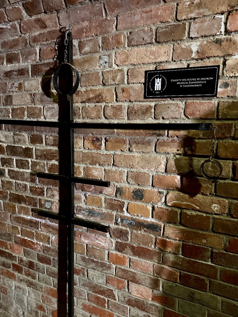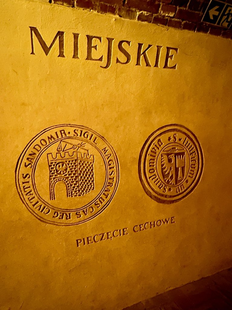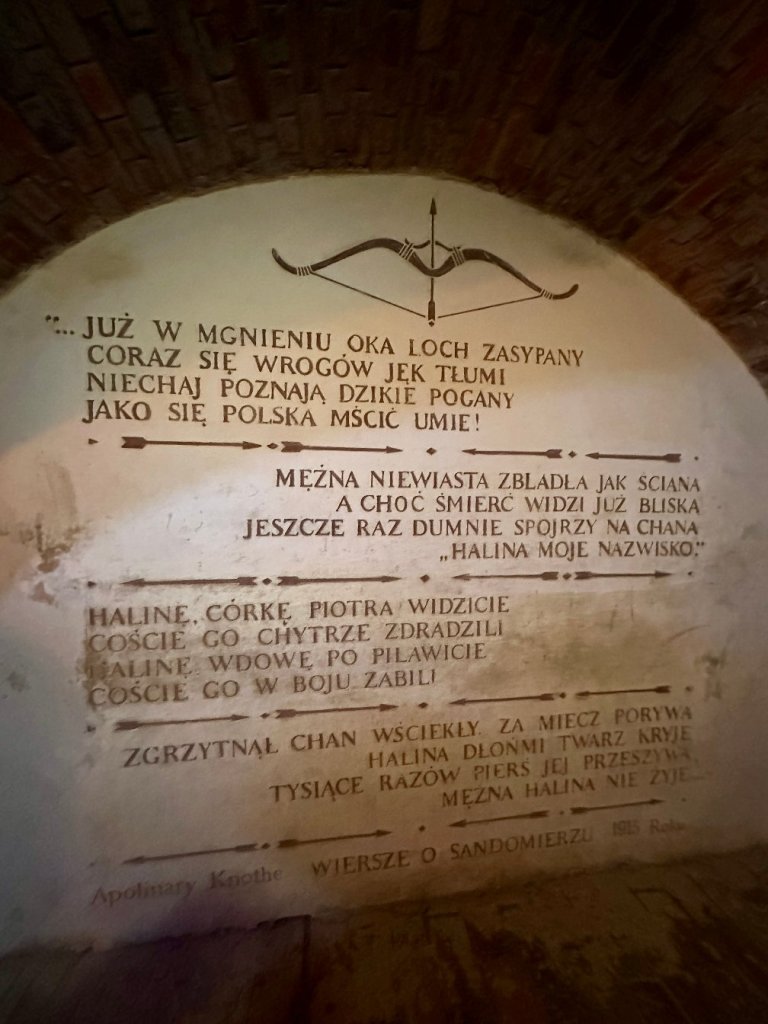 Rozglądamy się po ceglanych wnętrzach. Na jednej ze ścian widnieje napis – wiersz o Sandomierzu autorstwa Apolinarego Knothego z 1915 roku. Ruszamy dalej gęsiego wąskimi korytarzami i stromymi schodkami.