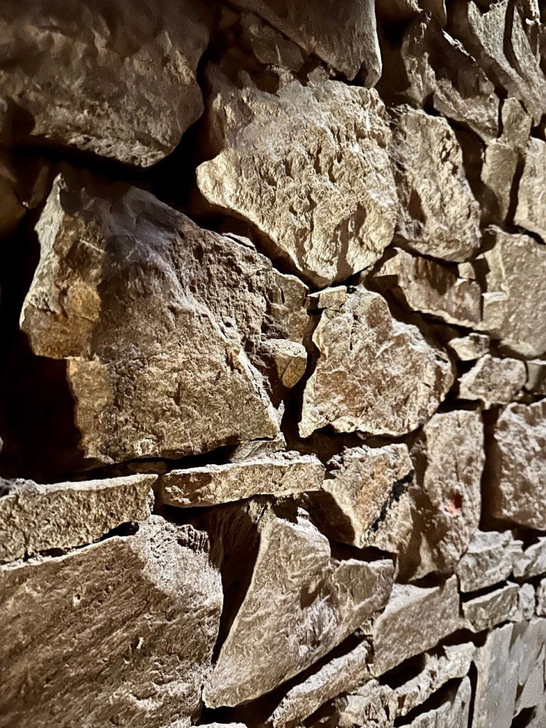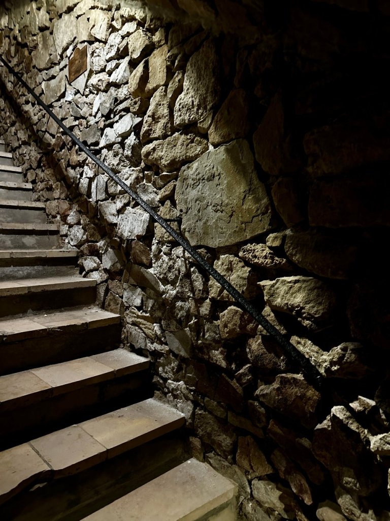 Idziemy w górę kamiennymi schodkami. Ściany zbudowane są z nieregularnego kamienia, bardzo dekoracyjnego.