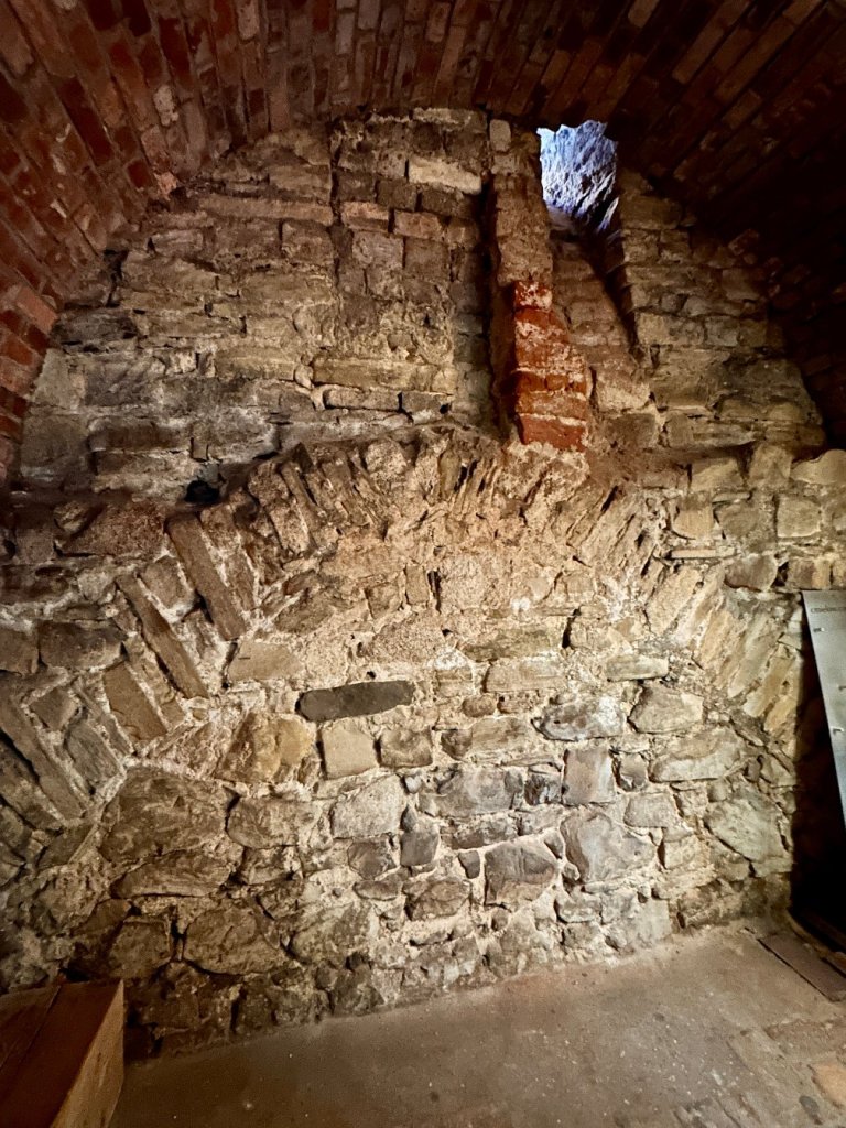 Docieramy do komory z łukami odbudowanymi z oryginalnych cegieł. Struktura łuków i zróżnicowane kolory cegieł naprawdę przykuwają wzrok, choć stoimy zbici w ciasną grupkę.