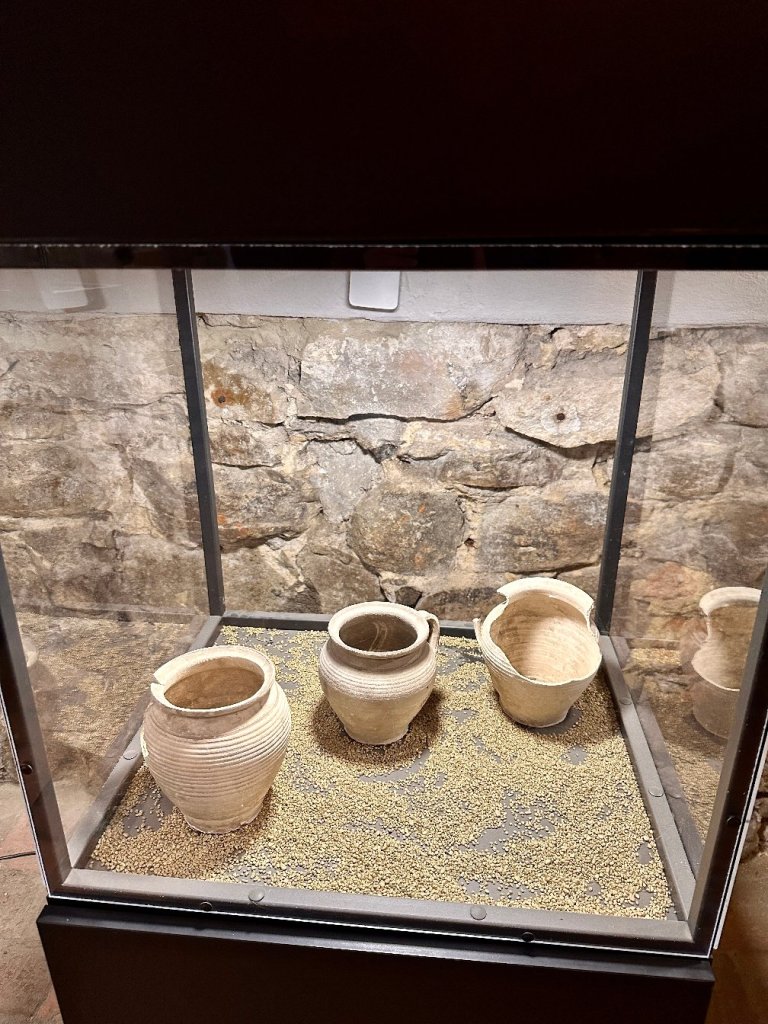 Kilka gablot z zabytkami z różnych okresów, misy, dzbanki, drobne przedmioty.