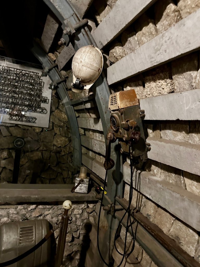 Ten fragment wygląda najbardziej współcześnie. Metalowe elementy, kable, wzmocnienia, hologram i filmy o pracy górników oraz zdjęcia sprzętu.