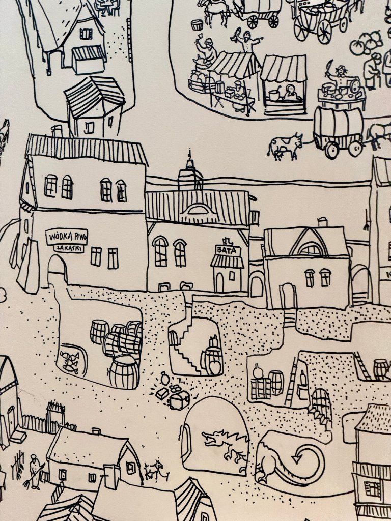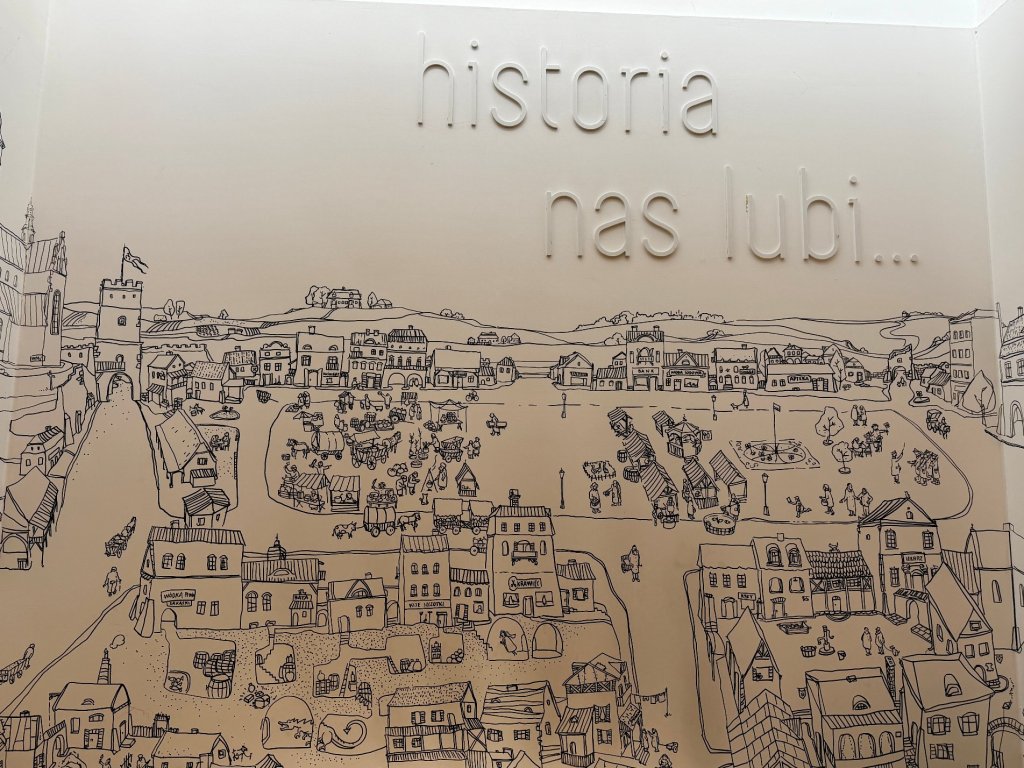 Przed wejściem uwagę przyciąga rysunek dawnego Opatowa na ścianie. Taki szkic miasta z targiem i budynkami, trochę jak bazgroły w zeszycie. Prosty, ale bardzo klimatyczny, jeden z fajniejszych elementów całej ekspozycji.