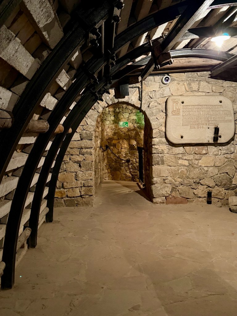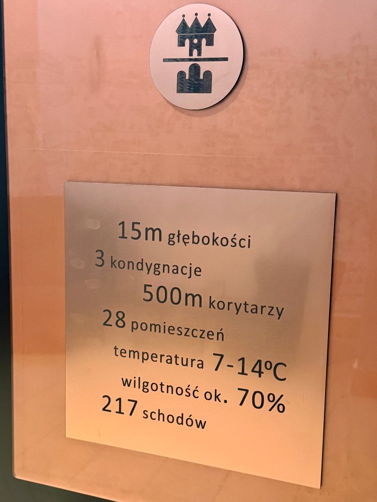Czytamy podstawowe dane: 15 metrów głębokości, trzy kondygnacje, 500 metrów trasy i 217 schodów. Krócej niż w Sandomierzu, ale głębiej. Jest też informacja, że nie można nagrywać, ale zdjęcia są dozwolone.