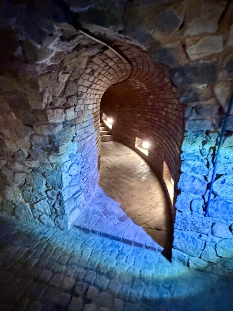Schody są wąskie i dość strome, a w środku panuje półmrok. Przewodniczka świeci latarką pod nogi, żeby było widać kolejne stopnie.