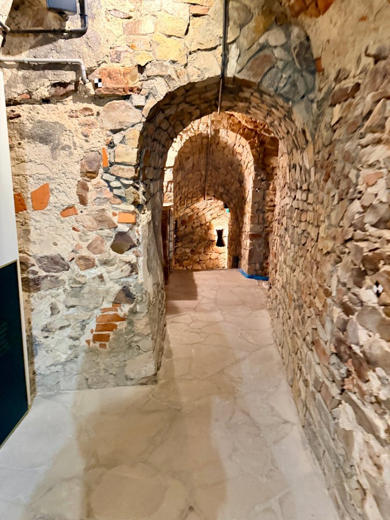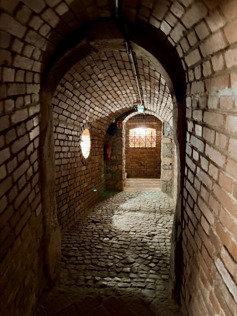 Przechodzimy przez bramę oddzielającą dawne piwnice kupieckie. W jednym z „okienek” widać fragment oryginalnej ściany, bardzo podobny do tego, który pamiętamy z Sandomierza.