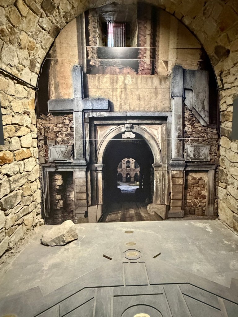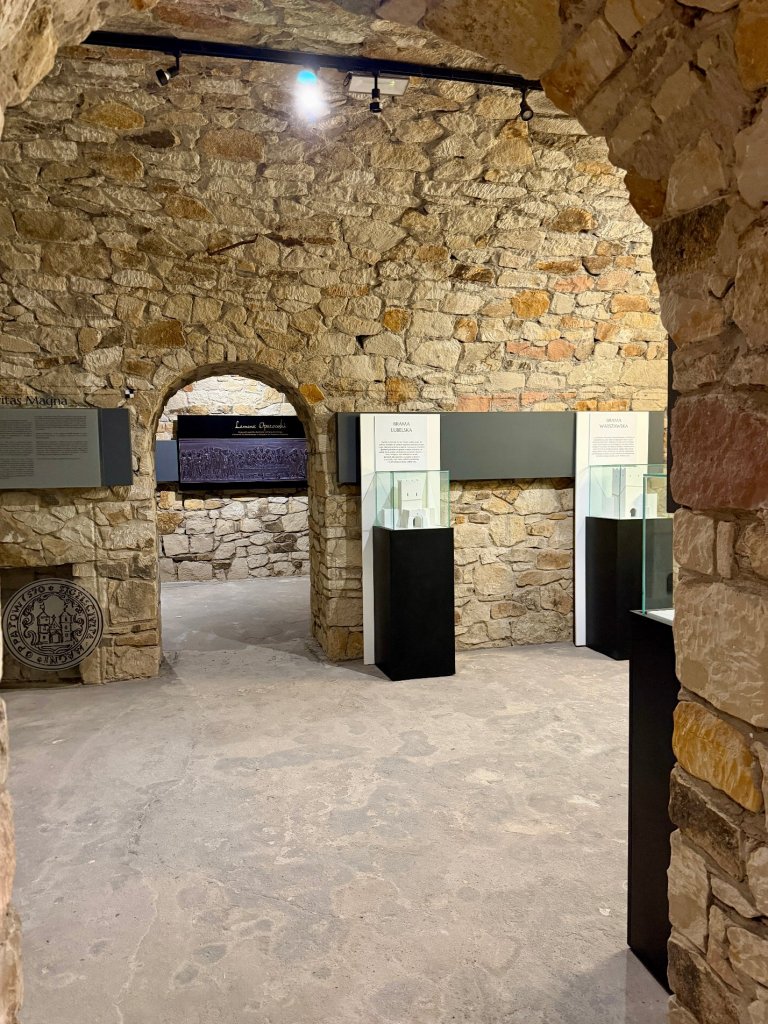 Na ścianach wiszą ilustracje przedstawiające rekonstrukcje dawnej zabudowy, portyk lub bramę wjazdową oraz dwie rekonstrukcje posągów rycerzy. Jedna trzyma miecz, druga topór. Niestety znów ruszamy dalej, trochę z poczuciem niedosytu.