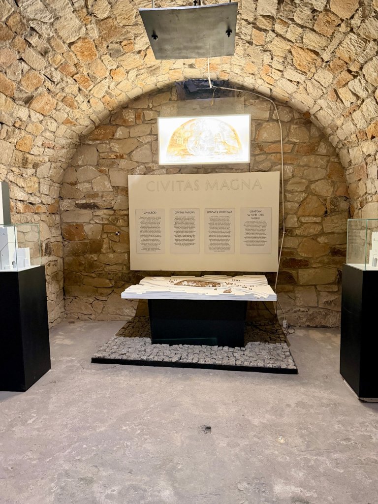 Dowiadujemy się też czegoś, o czym wcześniej nie myśleliśmy, w XVI i XVII wieku istniała tu duża dzielnica żydowska. Synagoga nie przetrwała do naszych czasów, ale na planszach pokazano jej archiwalne zdjęcia i krótką historię tej społeczności. To jeden z tych wątków, które na moment zatrzymują i przypominają, jak wielowarstwowe było to miasto.