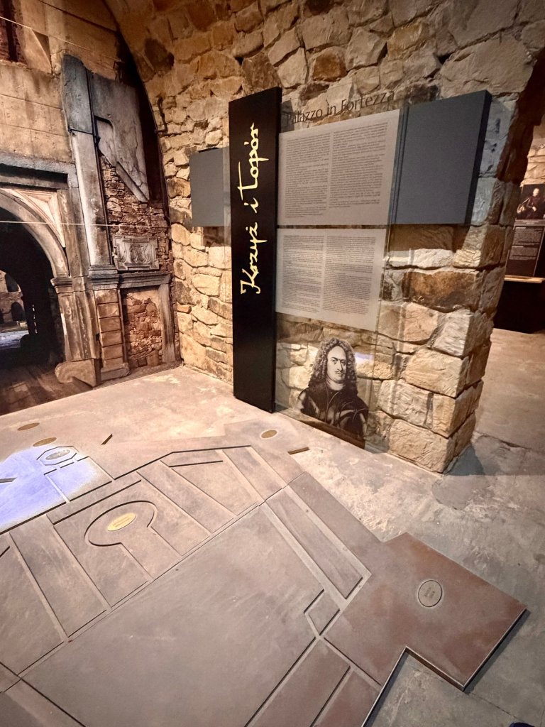 W kolejnej sali na podłodze przedstawiony jest plan zamku Krzyżtopór. Zatrzymujemy się odruchowo, bo to miejsce dobrze znamy, byliśmy tam wcześniej, chodziliśmy po ruinach i pamiętamy skalę całego założenia. Fajnie zobaczyć je teraz w takiej „naziemnej” formie, z góry, jak na płaskiej makiecie.
