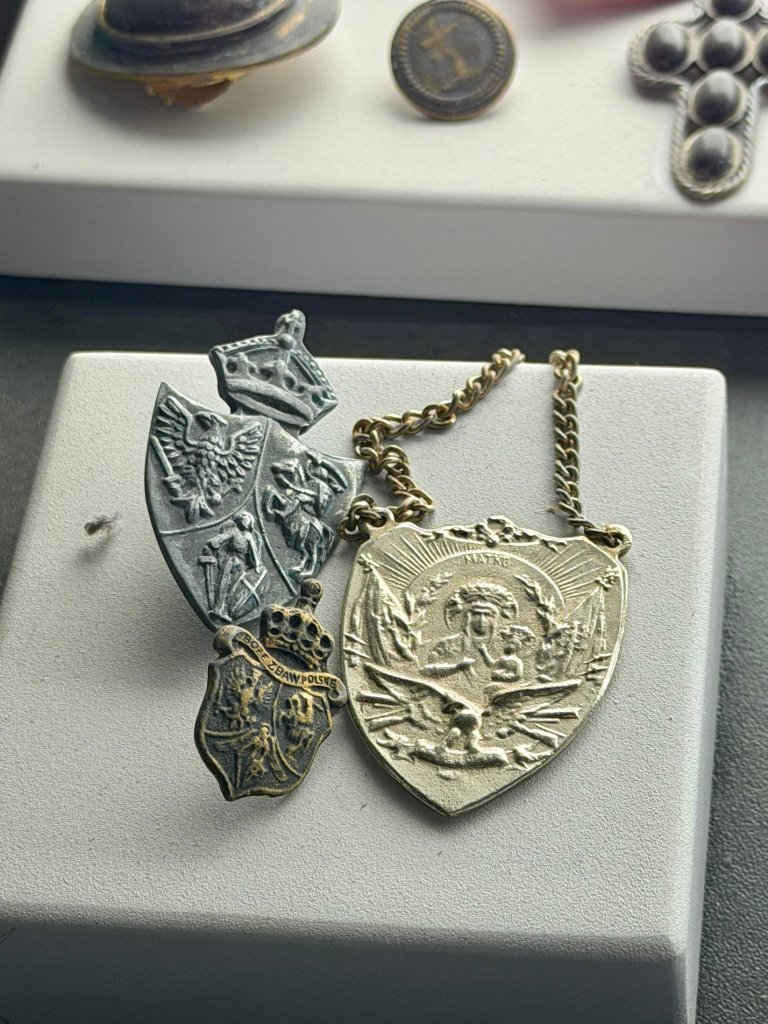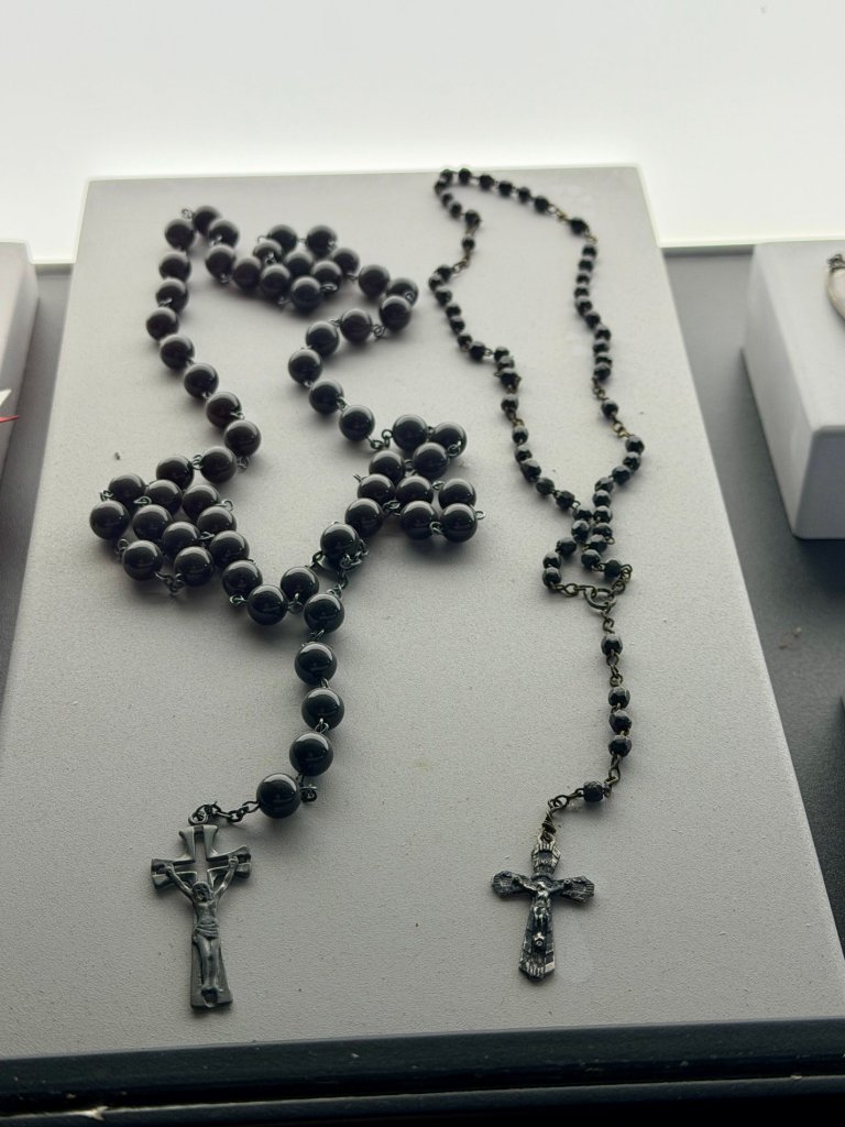 Widzimy repliki żałobnej biżuterii: czarne różańce, obrączkę w kształcie korony cierniowej.
