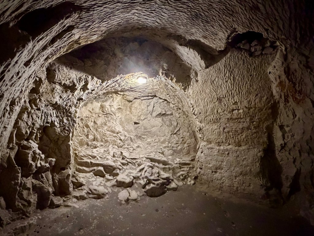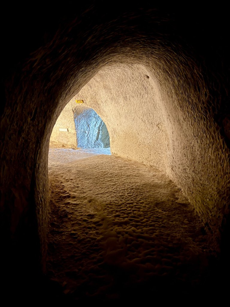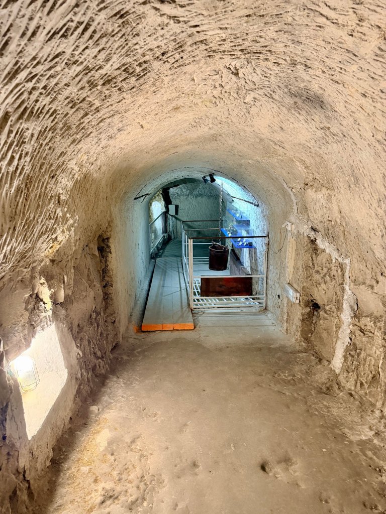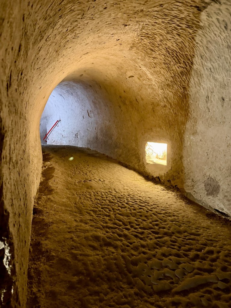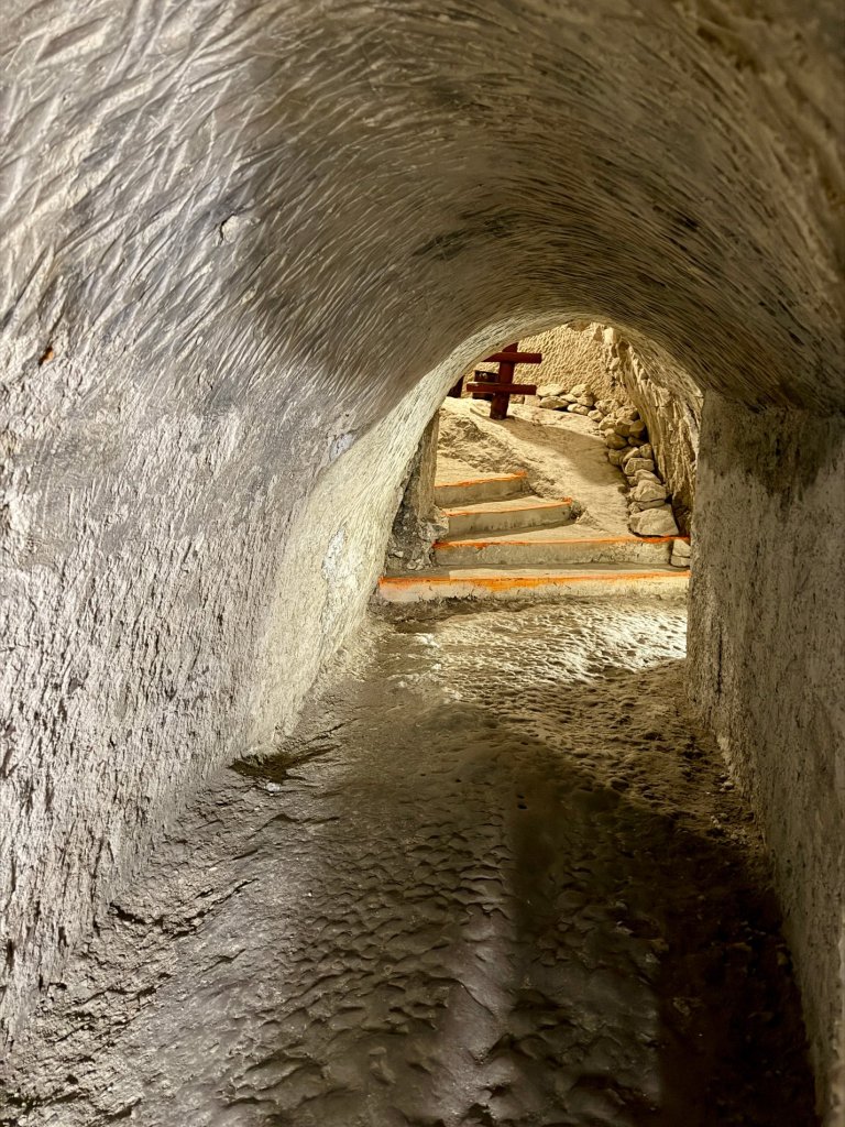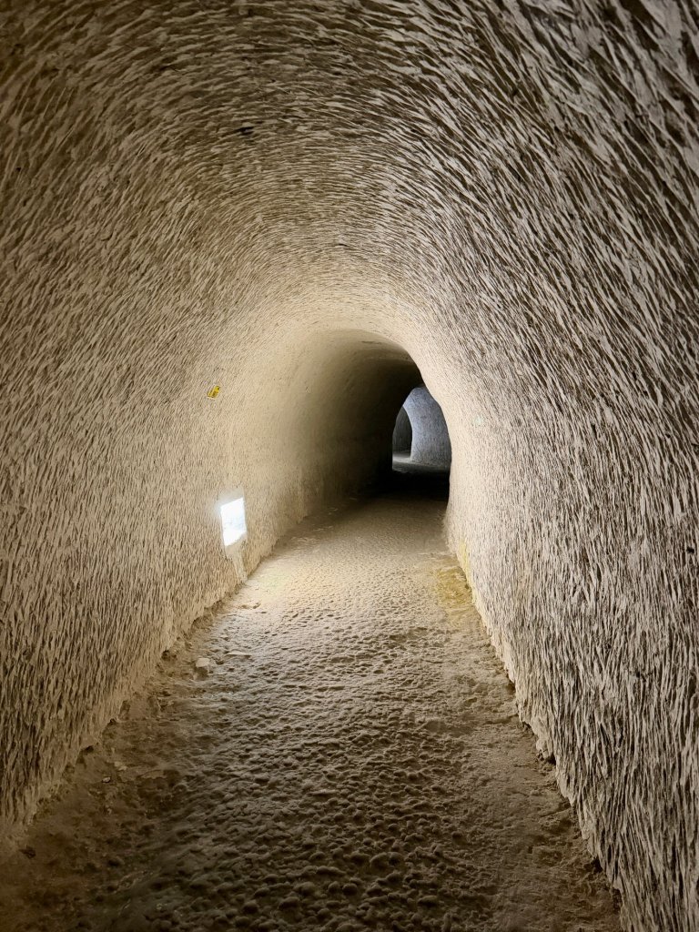 Schodzimy w dół po schodach. Z każdym krokiem robi się ciszej i zaskakująco cieplej. Pojawiają się kredowe korytarze z łukowatymi sklepieniami, jasne, chropowate ściany o nieregularnej fakturze.