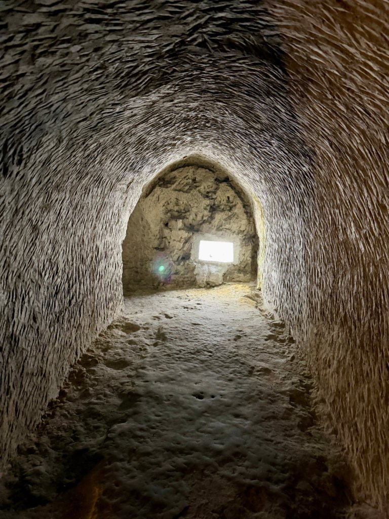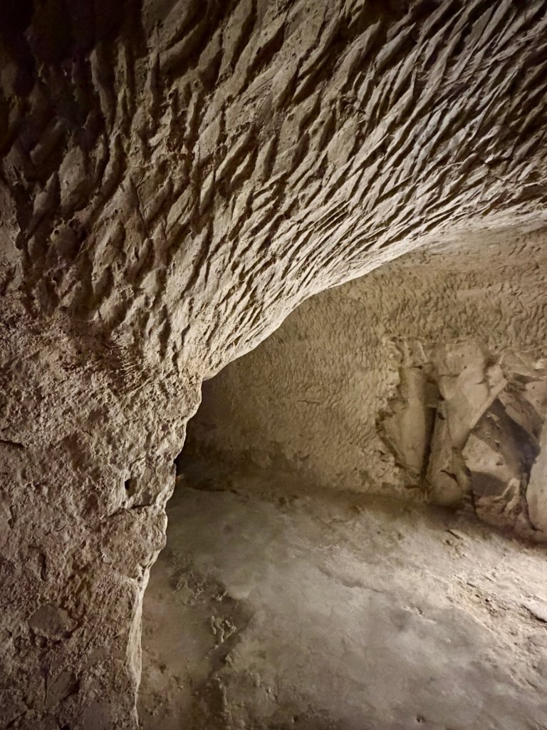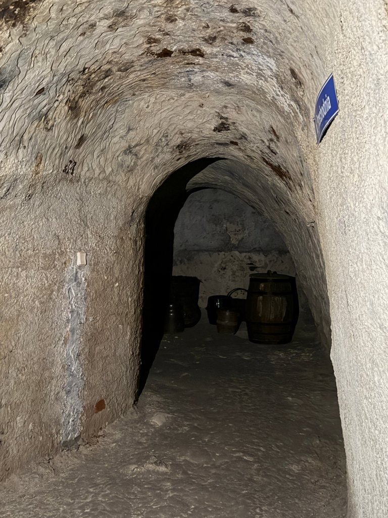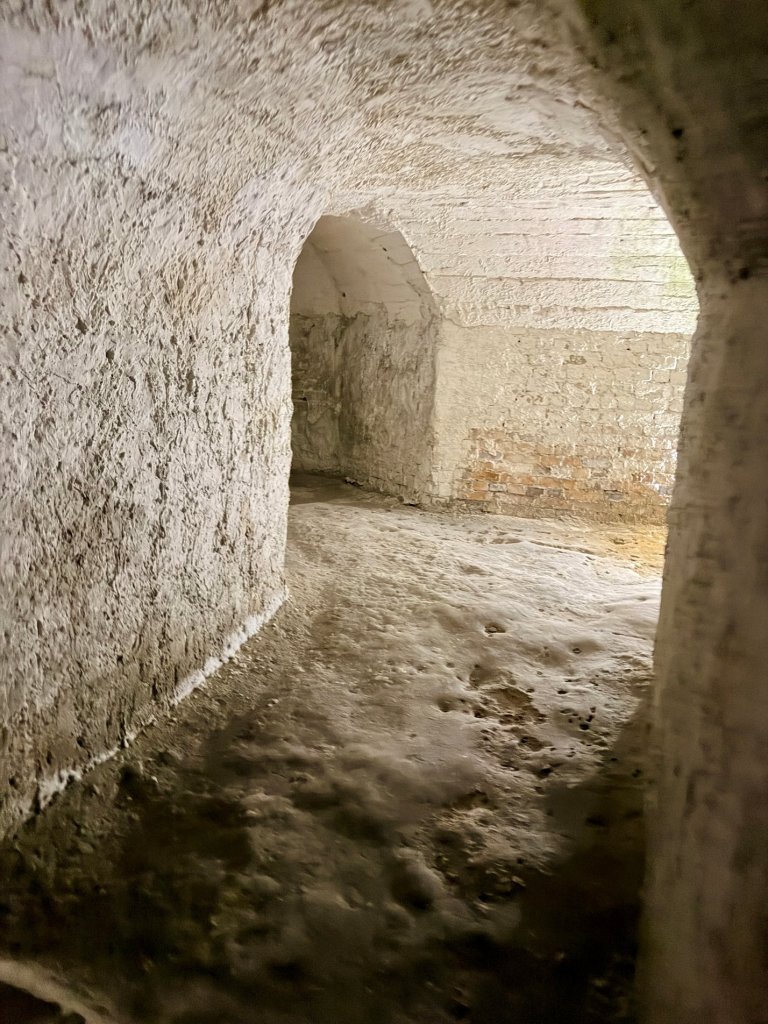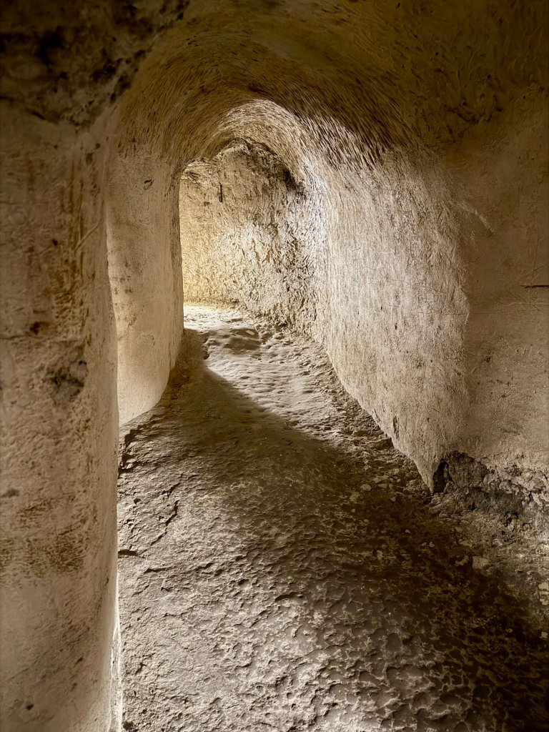 Schodzimy w dół po schodach. Z każdym krokiem robi się ciszej i zaskakująco cieplej. Pojawiają się kredowe korytarze z łukowatymi sklepieniami, jasne, chropowate ściany o nieregularnej fakturze.