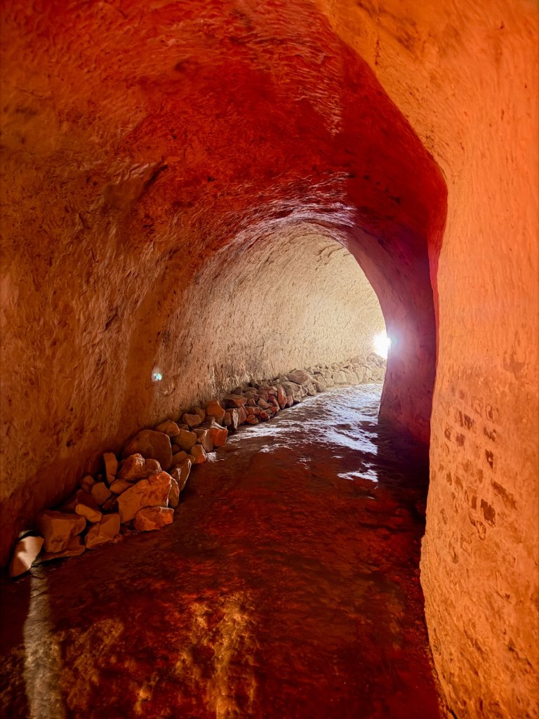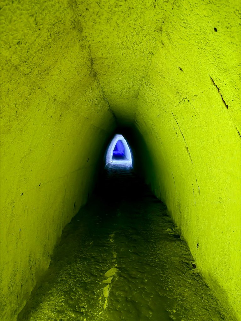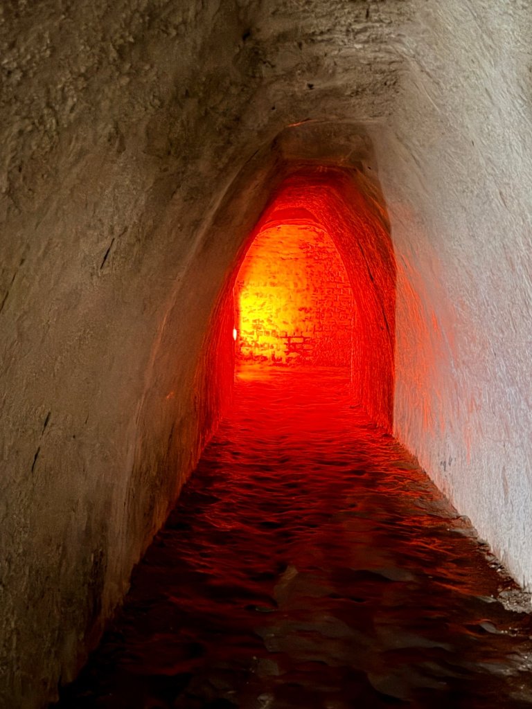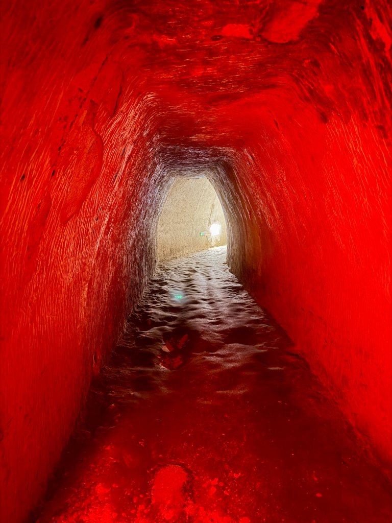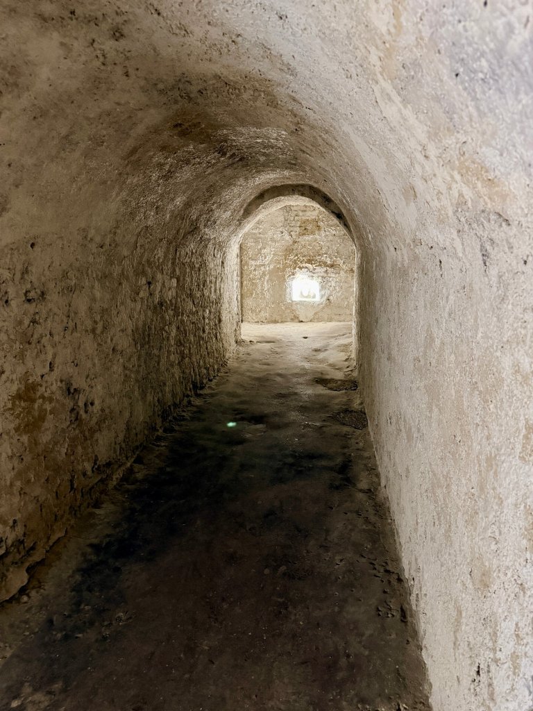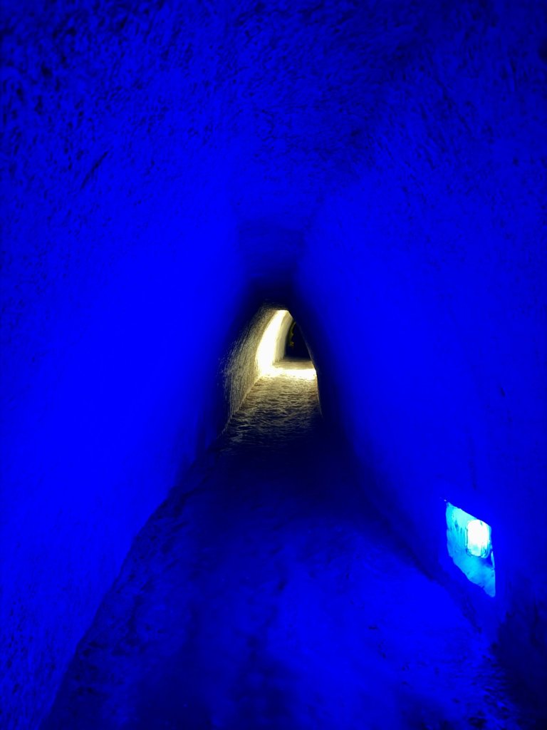 Schodzimy w dół po schodach. Z każdym krokiem robi się ciszej i zaskakująco cieplej. Pojawiają się kredowe korytarze z łukowatymi sklepieniami, jasne, chropowate ściany o nieregularnej fakturze.