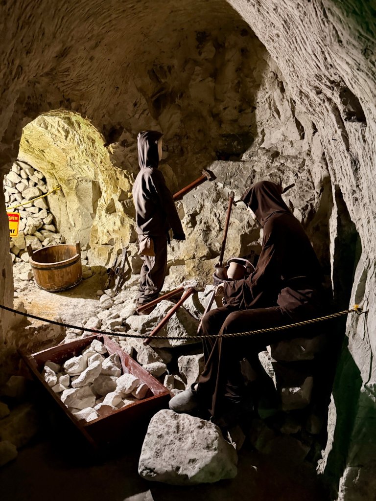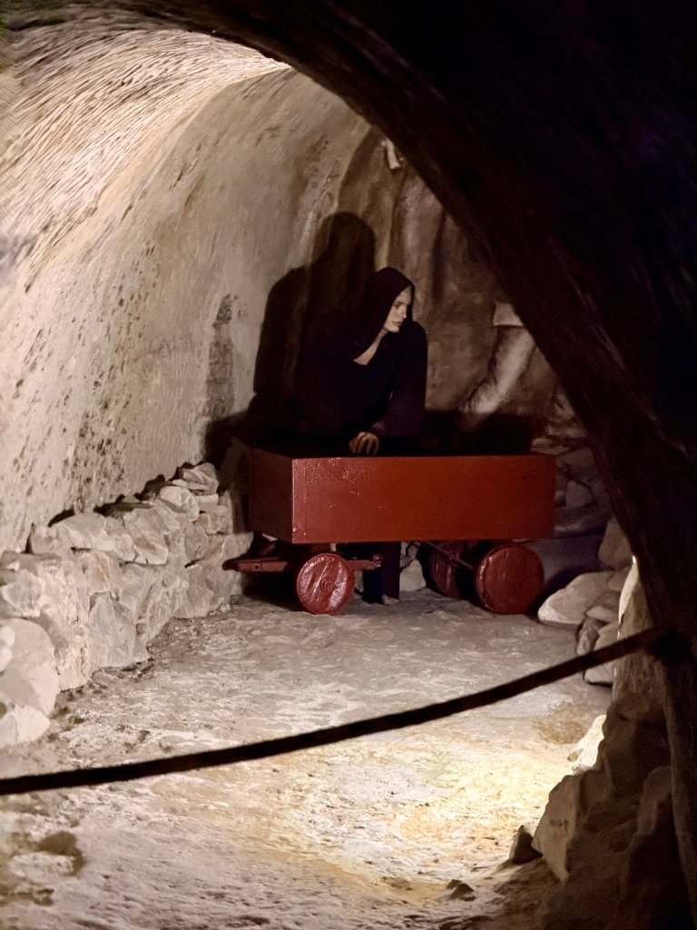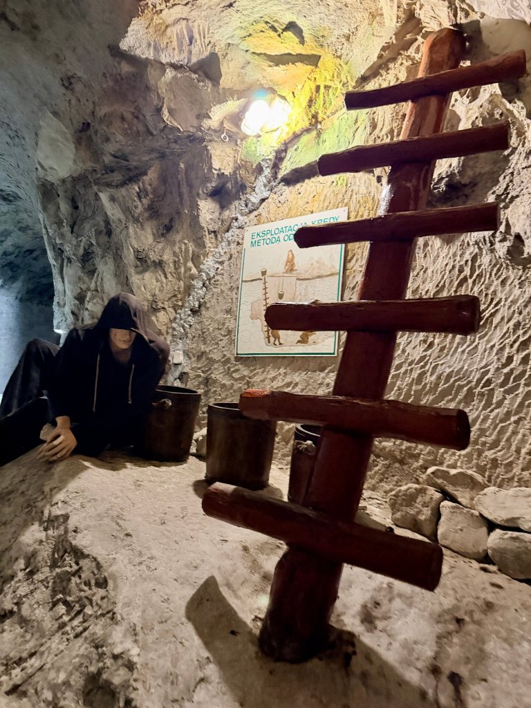 W kolejnych wnękach pojawiają się inscenizacje dawnych górników i narzędzia wydobywcze. Postacie z wiadrami, scenki pokazujące, jak kiedyś wiadrami wynoszono z podziemi kredę. Trochę jak teatralne dekoracje, ale pomagają wyobrazić sobie codzienność pracy pod ziemią.