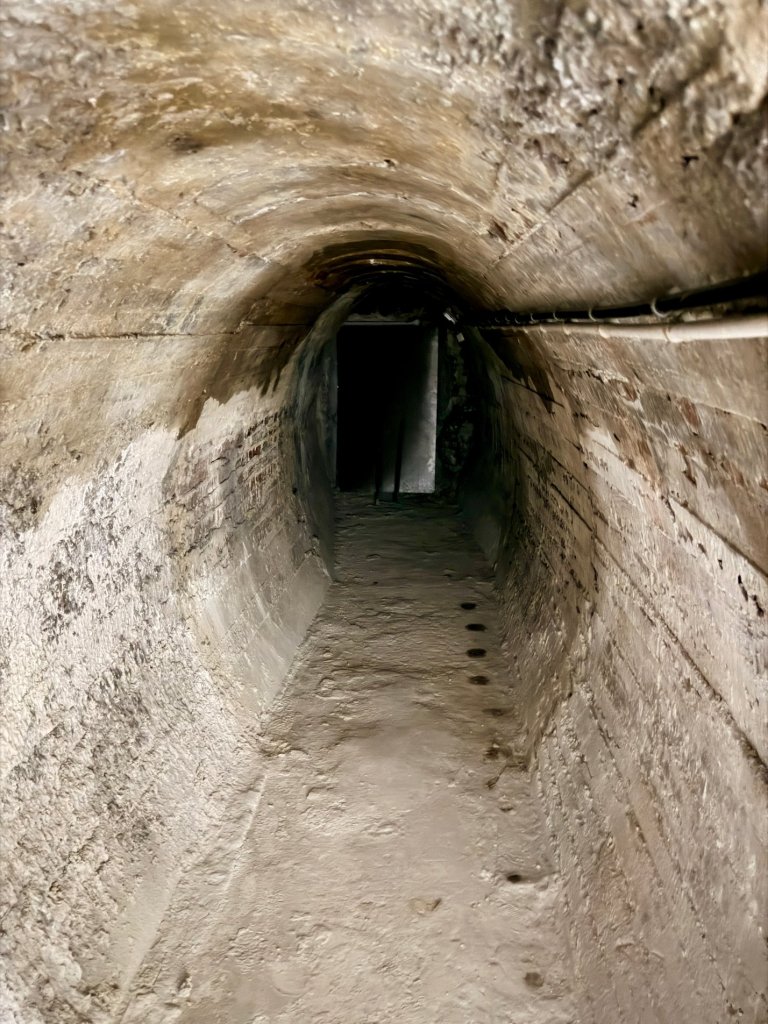 Mijamy jeszcze jedną historyczną ekspozycję, której prawie nie widać w półmroku. Potem wchodzimy w bardziej wzmocnione korytarze, z betonowymi zabezpieczeniami. Nad głową wciąż mamy kredowe sklepienie.