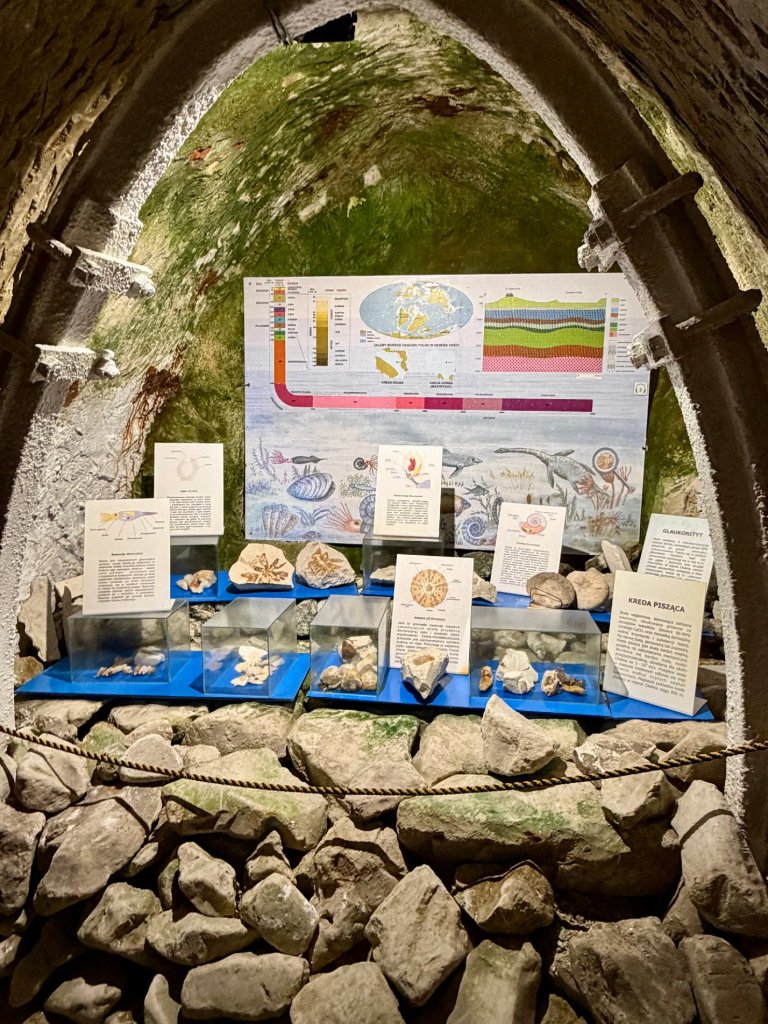 Na koniec trafiamy do małej sali z łukowatą, wzmocnioną wnęką, gdzie przygotowano ekspozycję geologiczną. Widzimy w niej amonity, jeżowce, gąbki i inne skamieniałości. Przewodnik ciekawie opowiada o tym, jak powstawała kreda i ile milionów lat mają te osady.