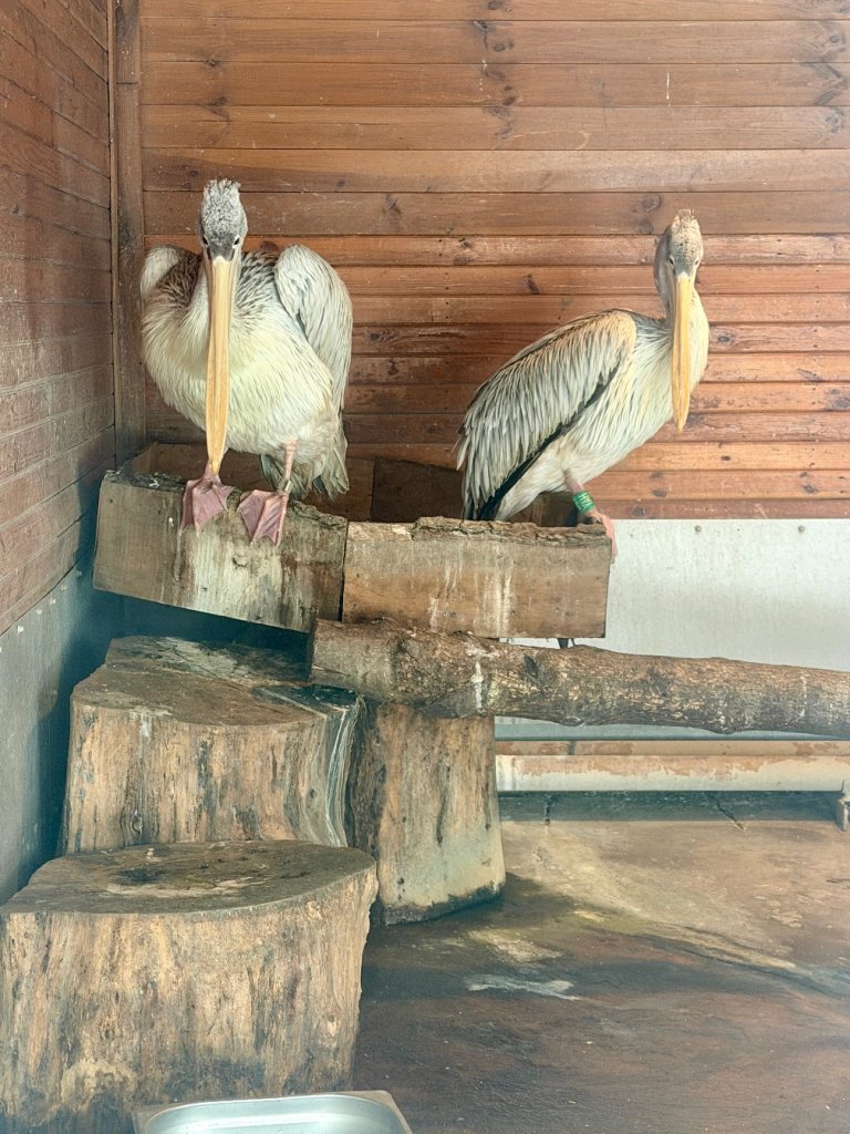 Przez szybkę zaglądamy do środka i widzimy dwa pelikany siedzące blisko siebie. Są lekko skulone, jakby chroniły się przed chłodem. W półmroku wyglądają spokojnie i ciężko, prawie jak rzeźby.