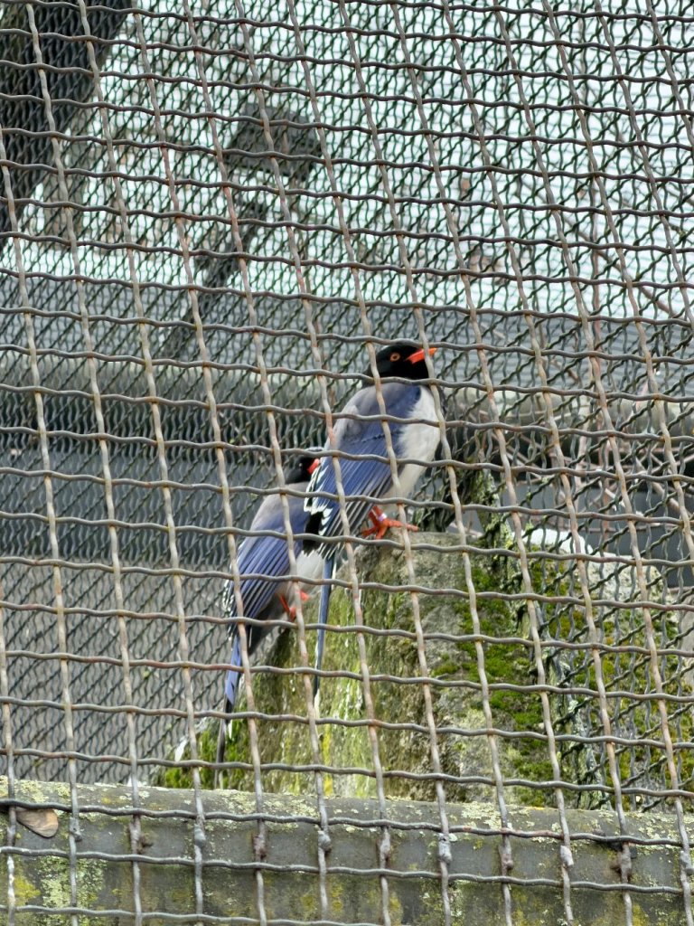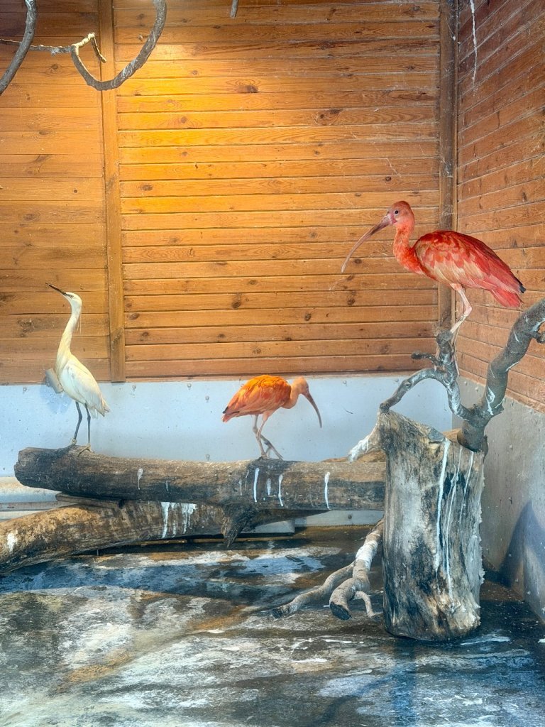 Idziemy wzdłuż wolier i najpierw widzimy… dzioby. Intensywnie czerwone, widoczne z daleka. Dopiero potem dostrzegamy całe ptaki.