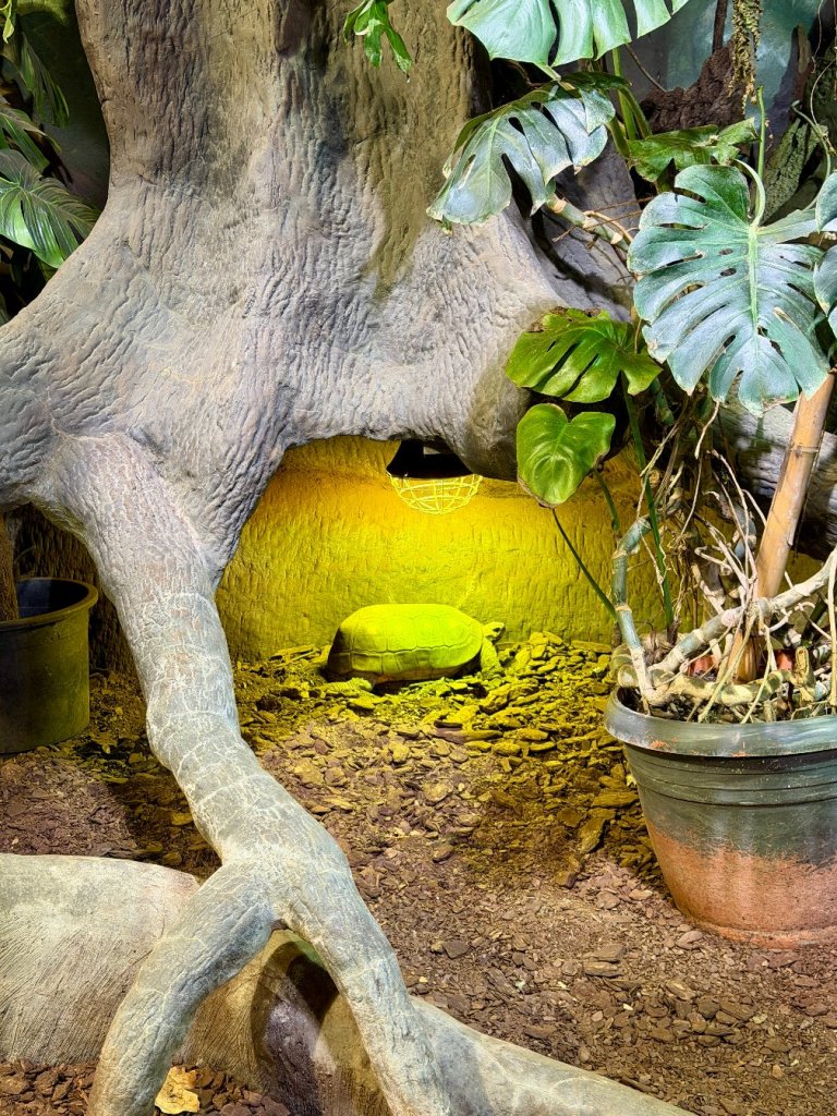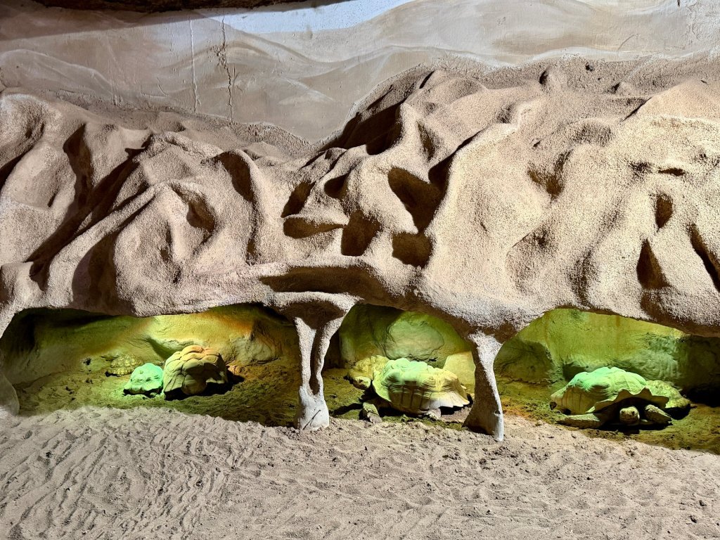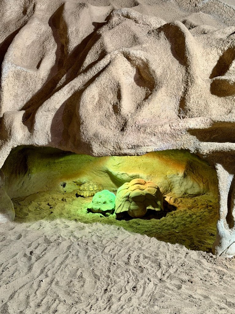 Piasek, lampy grzewcze i żółwie leżące w bezruchu. Jeden powoli sunie w naszą stronę. Czytamy, że w naturze często łzawią im oczy. Mają w sobie jakiś spokój, który udziela się i nam.