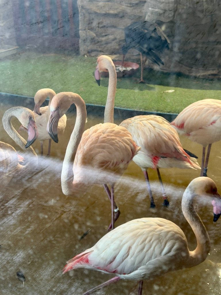 Podchodzimy do kolejnego pawilonu i zerkamy przez szybę. Flamingi stłoczone są razem przy jedzieniu. Czytamy, że podobnie jak u ibisów młode są szare, a dorosłe różowieją od karotenu.