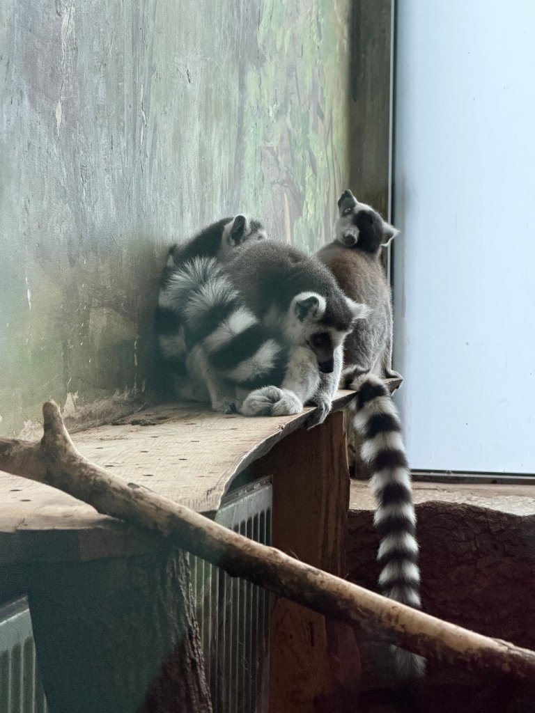 Lemury katta gromadzą się blisko grzejników. Siedzą zwinięte w kulki, wtulone w siebie nawzajem, jakby próbowały złapać jak najwięcej ciepła. Nakrywają się swoimi pasiastymi ogonami jak kocami. Wyglądają trochę jak futrzaste poduszki porozkładane po kątach wybiegu.