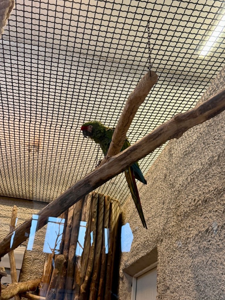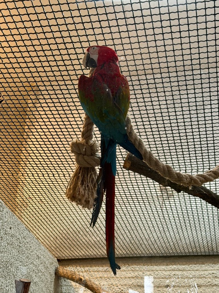 Jest też ara zielona, duża, majestatyczna, a reszta jej rodziny siedzi w głębi woliery. Dowiadujemy się, że łączy się w pary na całe życie i zjada glinkę, żeby neutralizować toksyny i uzupełniać minerały. To brzmi jednocześnie dziwnie i fascynująco.