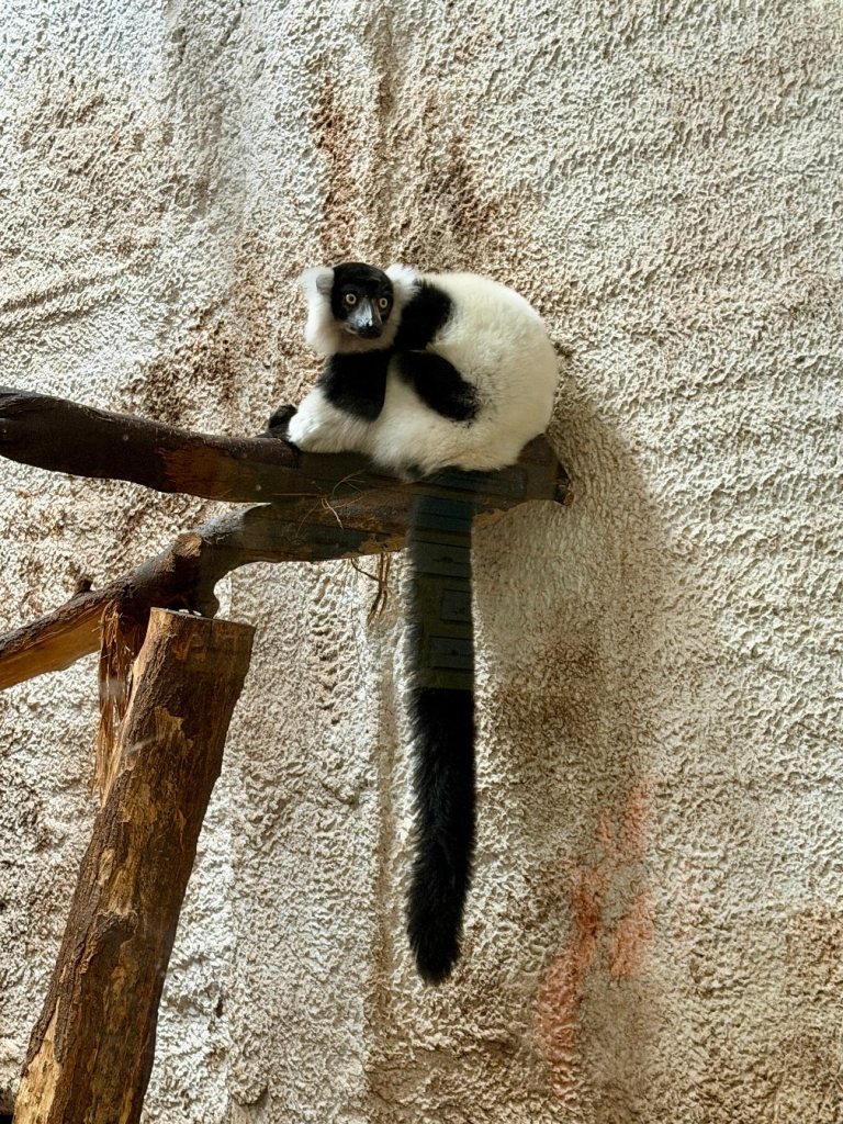 Dalej są lemury wari. Czarno-białe, puchate, z długimi ogonami zwisającymi z gałęzi. Siedzą raczej spokojnie, bez tej „kociej” potrzeby przytulania się do kaloryfera. Dowiadujemy się, że jako jedyne wśród lemurów nie noszą młodych na grzbiecie, a dodatkowo są jedynymi naczelnymi, które budują gniazda wyłącznie na czas porodu i pierwszych tygodni opieki nad młodymi. To jedna z tych ciekawostek, które sprawiają, że zaczynamy patrzeć na nie zupełnie inaczej.