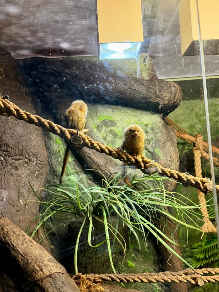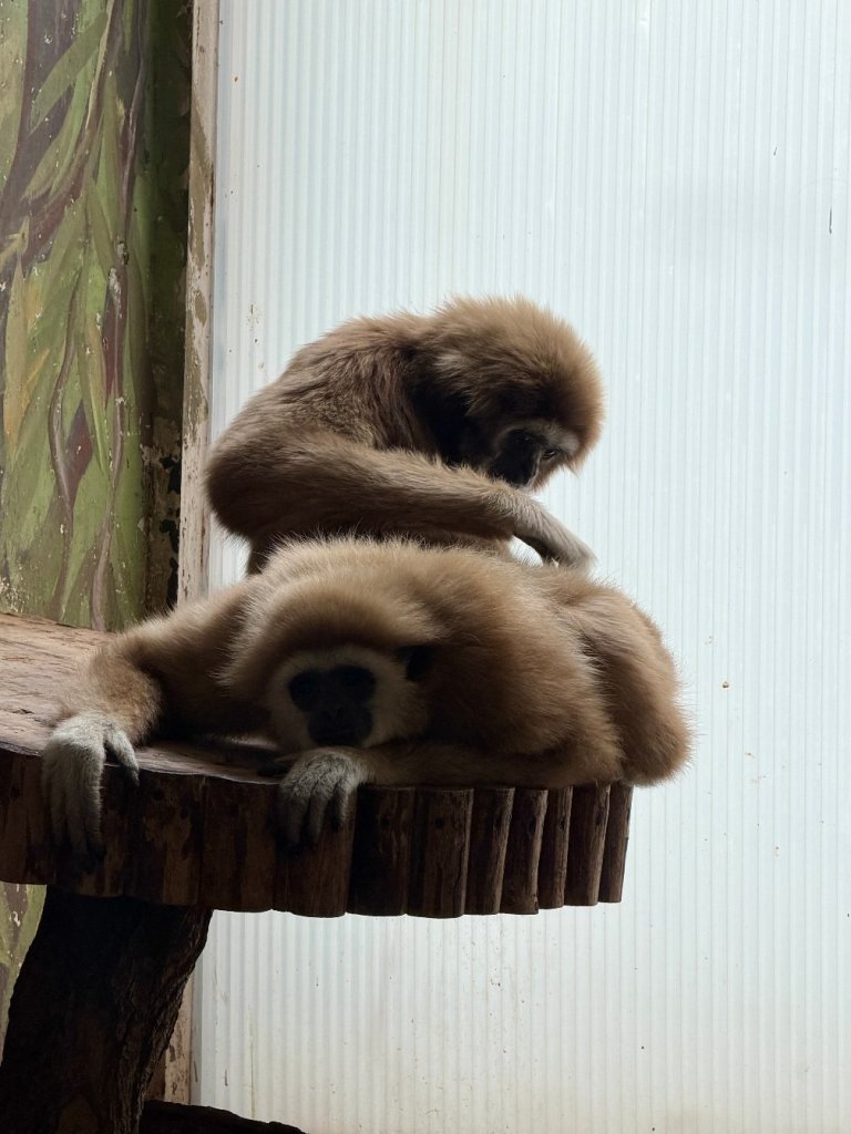 Na końcu gibbony. Większe, spokojniejsze, ale gdy zaczynają się ruszać, robi się widowisko. Skaczą z gałęzi na gałąź na kilka metrów, huśtają się na rękach, potem siadają obok siebie i iskają się nawzajem. Czytamy, że potrafią pokonywać skoki długości 9–12 metrów, nie mają ogona i nie pływają. Stoimy długo i po prostu patrzymy. Dwa ciemniejsze, dwa jaśniejsze, jak mała rodzina.