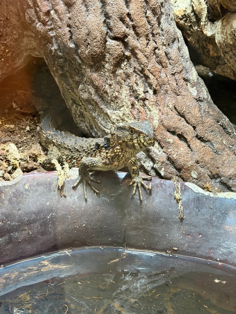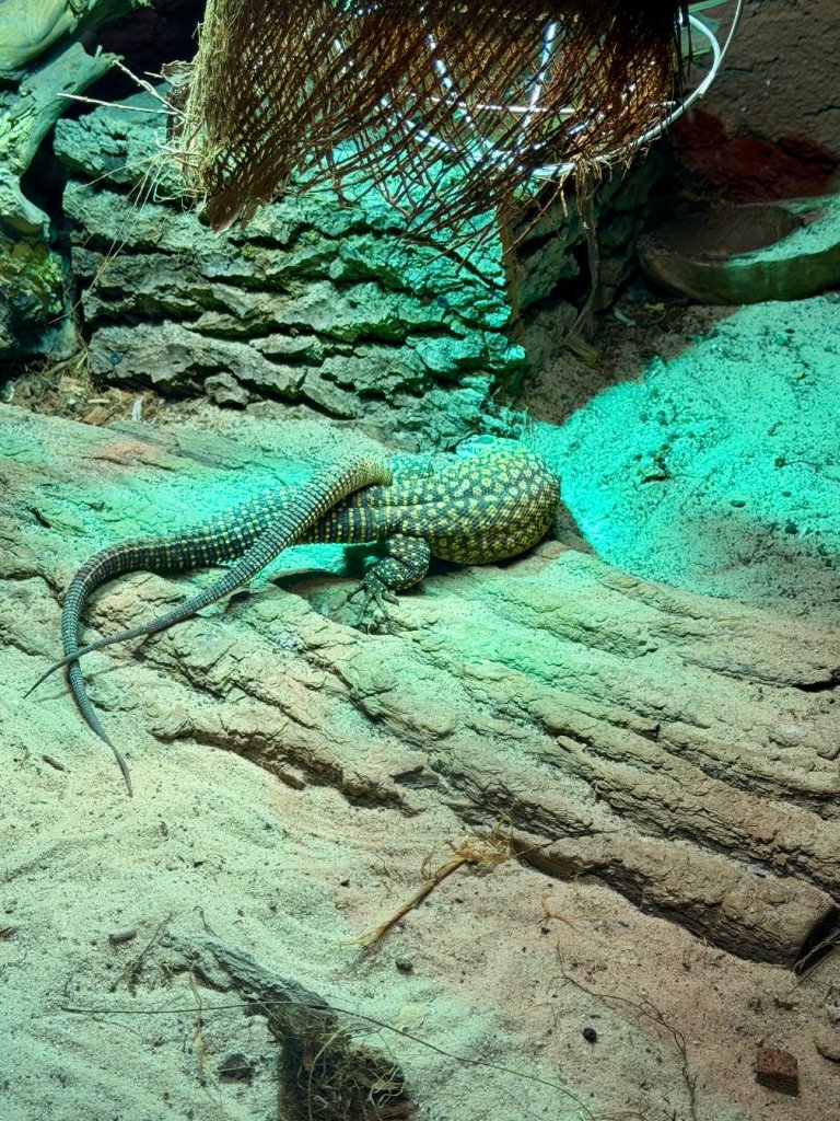 Pod lampą leżą dwa warany kolczastoogonowe. Czytamy, że to jedne z najmniejszych waranów. Wyglądają jak rzeźba z dwoma ogonami, nie ruszają się zupełnie.