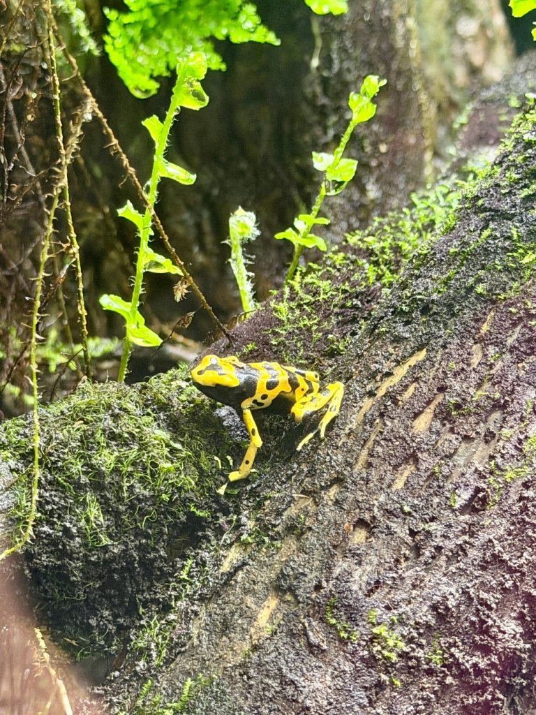 Czarno-żółte, małe i toksyczne. Wyglądają jak żaby o umaszczeniu salamnadry. Czytamy, że alkaloidy mogą powodować ból i paraliż, na dodatek nie potrafią pływać. Patrzymy jak spacerują spokojnie po gałęziach terrarium.