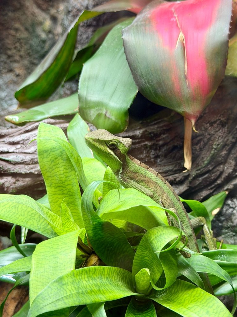 Soczyście zielone żaby niemal znikają wśród roślin. Ciekawostka z tabliczki: podczas przełykania chowają oczy i „przepychają” nimi pokarm. Trochę straszne, trochę fascynujące. Zaczynamy patrzeć na nie nieco inaczej. Na szczęście, żadna z nich nic nie je.