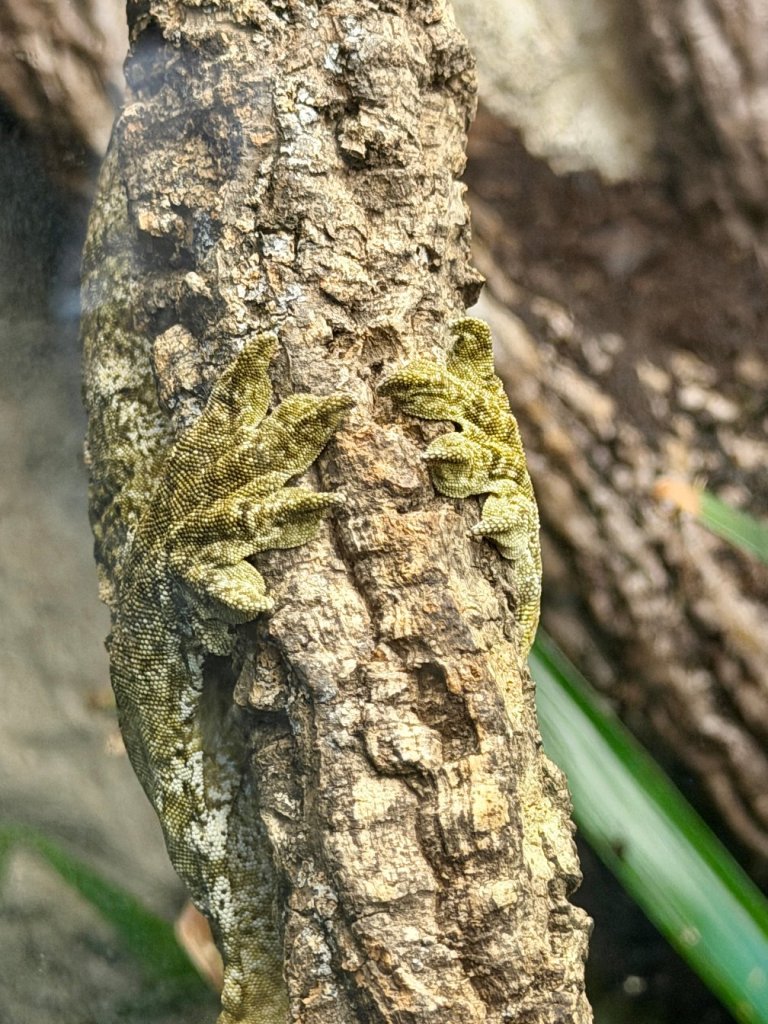 Największego gekona szukamy długo. W końcu widzimy… palce przyklejone do gałęzi. Maskowanie mistrzowskie. Dowiadujemy się, że nie mruga, tylko liże sobie oczy.