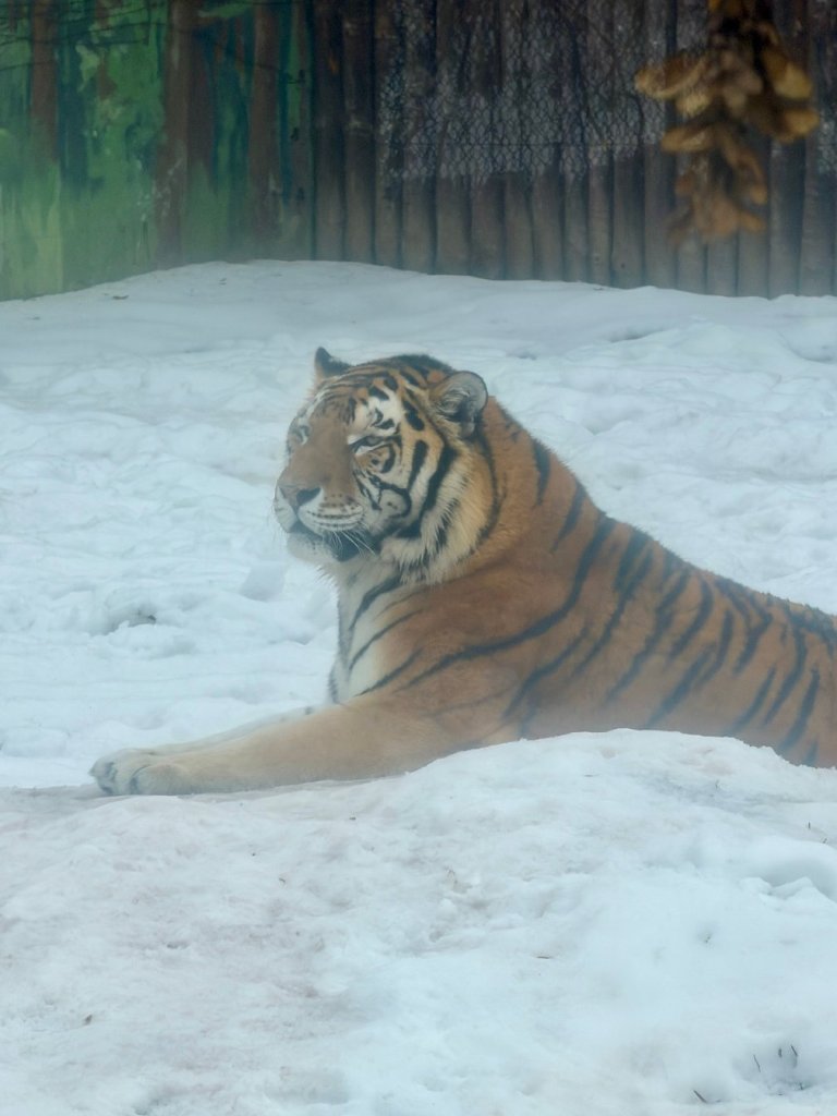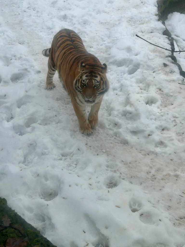 Wychodzimy z pawilonu. Na zewnątrz jest zimno i mżawka. Jeden tygrys odpoczywa, drugi krąży po wybiegu. W śniegu widać wielkie ślady łap.