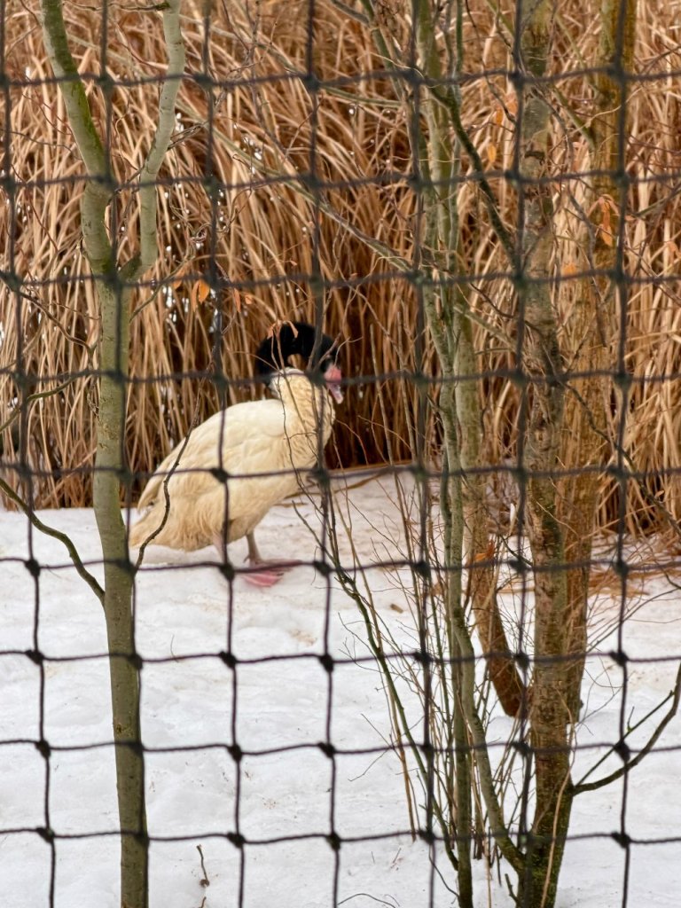Obok na zewnątrz w wolierze jest łabędź czarnoszyi, który wygląda, jakby ktoś faktycznie pomalował mu szyję pędzlem. Niestety stoi dosyć daleko od nas.