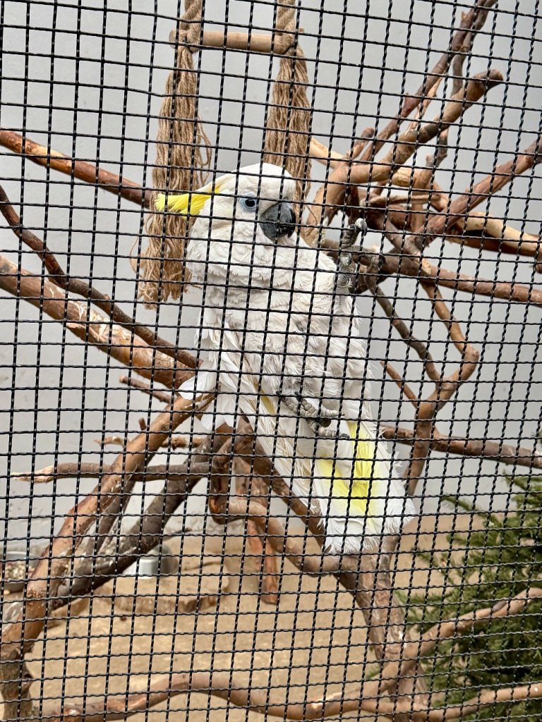 I nagle kakadu żółtoczube mówi do nas „siema” i „halo”. Zaczepia dziobem kraty, podchodzi blisko, domaga się uwagi. Gdy odchodzimy, krzyczy przeciągle. Wracamy. I znowu. Według tabliczki osiąga 135 decybeli – wierzymy bez wahania.