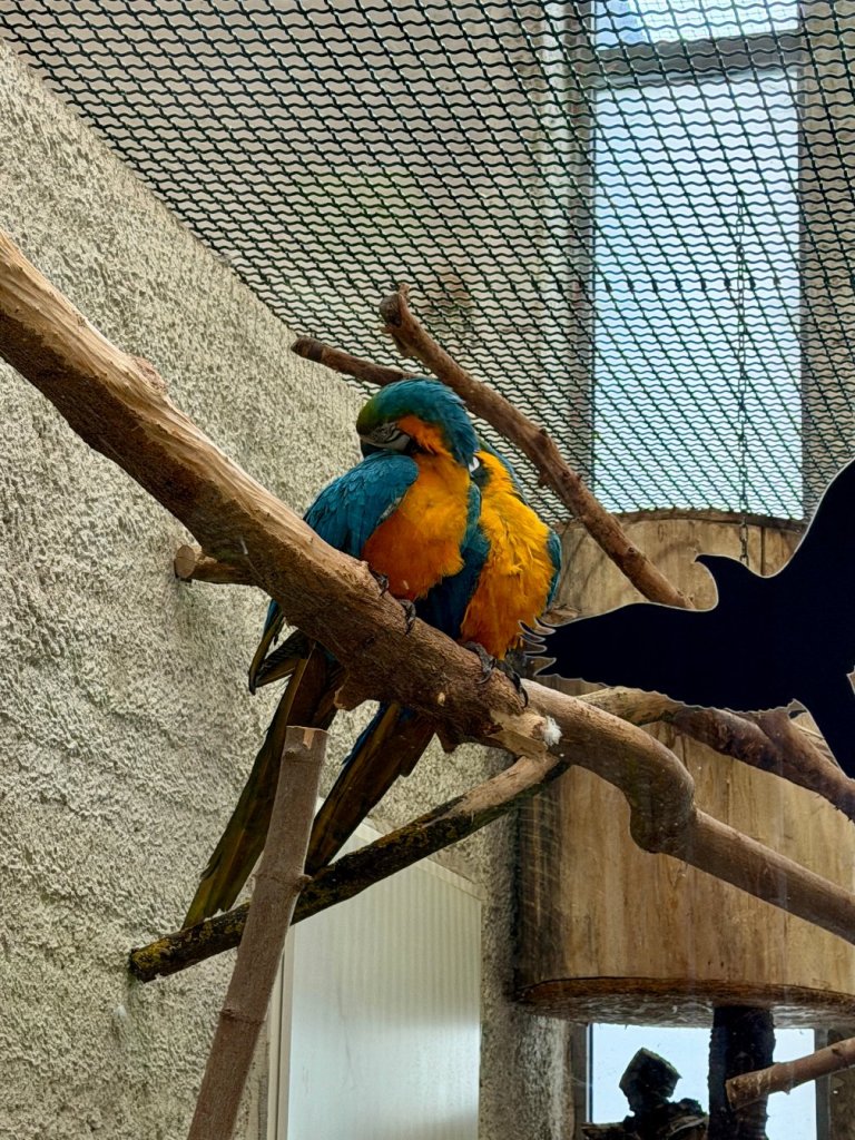 Dalej siedzą dwie ararauny zwyczajne z pomarańczowo-żółtymi brzuszkami. Czytamy, że nie mają widocznego dymorfizmu płciowego i stuprocentową pewność co do płci dają dopiero badania DNA. Siedzą wysoko, spokojnie nas obserwując.