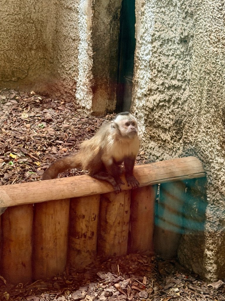 Kapucynki są mniejsze, bardziej zwinne, ciągle zajęte swoimi sprawami. Z tabliczki czytam, że są bardzo inteligentne i podatne na tresurę, bardzo zwinne. Patrzę, jak jedzą i przemieszczają się po gałęziach, widać w nich spryt i ciekawość świata.