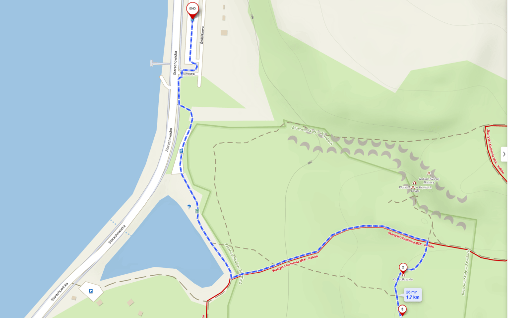 Trasa: Parking – Z parkingu skręcamy w lewo i idziemy wzdłuż szosy – Za około 100m skręcamy w lewo (przechodzimy przez szlaban) – Idziemy ścieżką z kostki brukowej do samego końca – Idziemy plażą do samego końca jeziorka i na końcu skręcamy w lewo na szlak czerwony – Kierując się szlakiem za około 200m dochodzimy do skałek – Wracamy do parkingu tą samą drogą – Parking