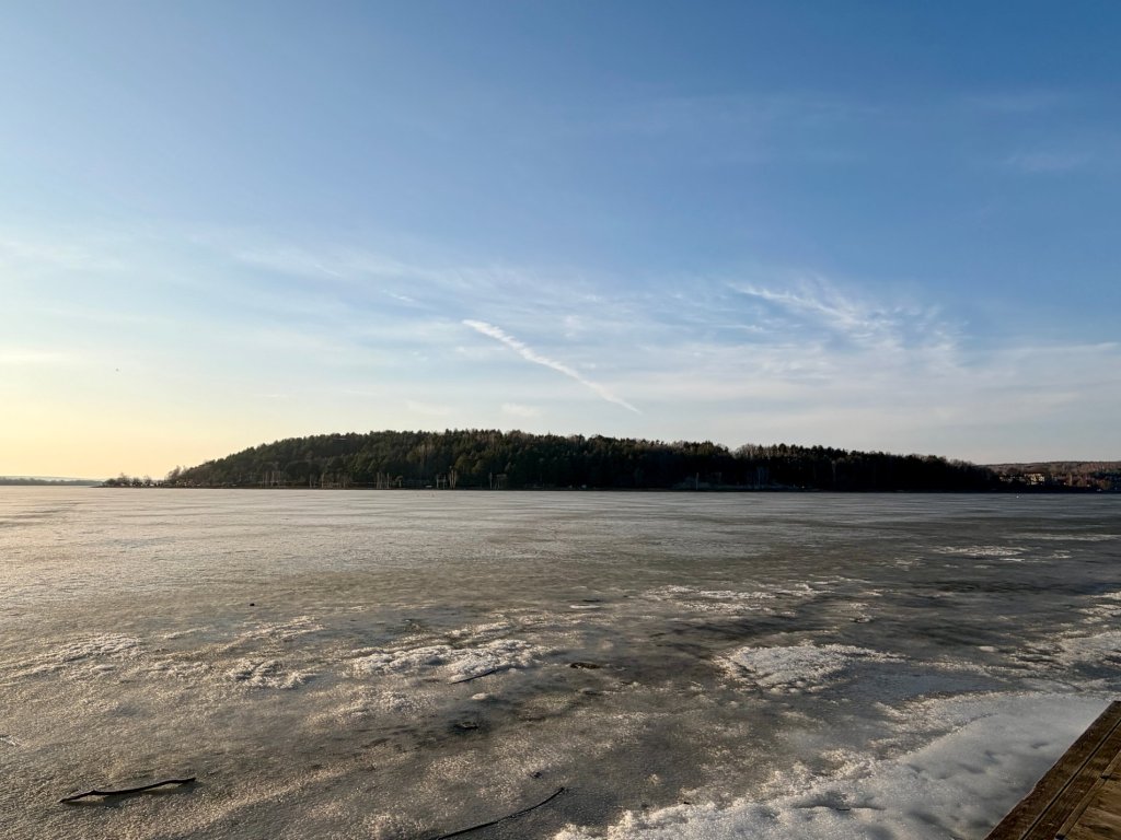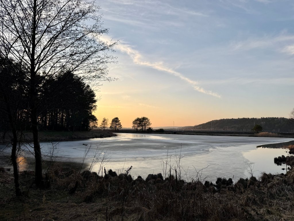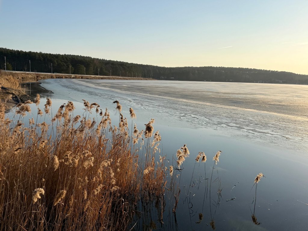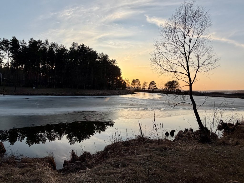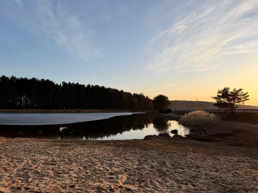 Zalew był częściowo zamarznięty, trzciny przy brzegu świeciły złotym światłem, a słońce powoli schodziło za linię lasu. Idealny moment, żeby chwilę po prostu postać i popatrzeć.