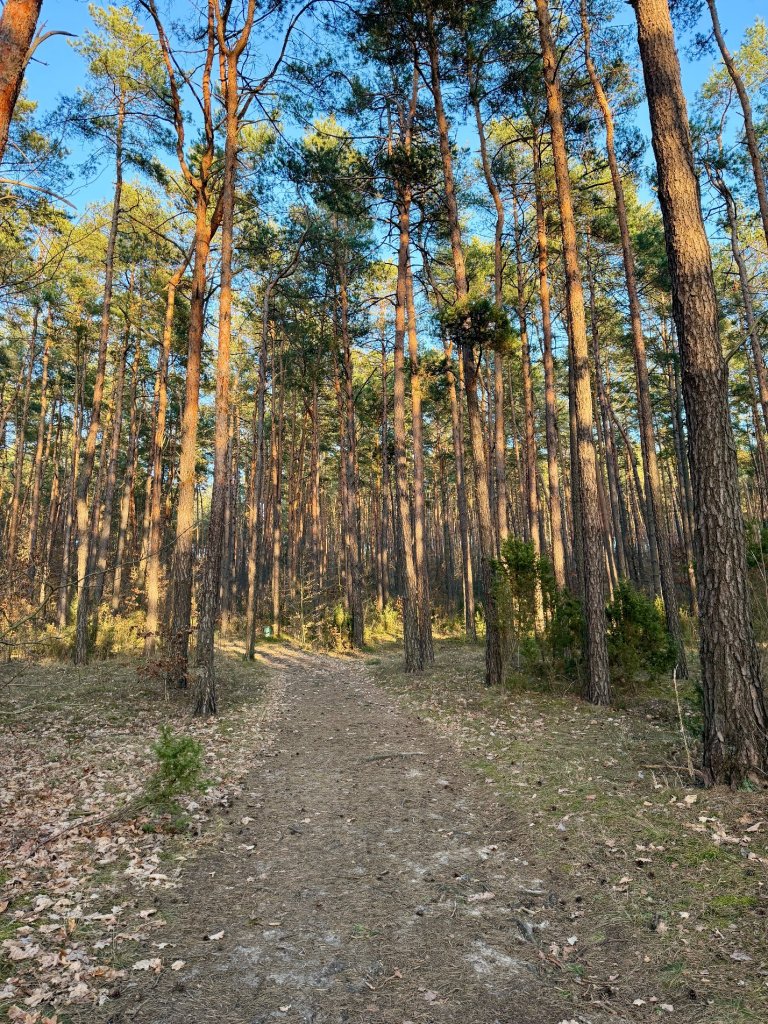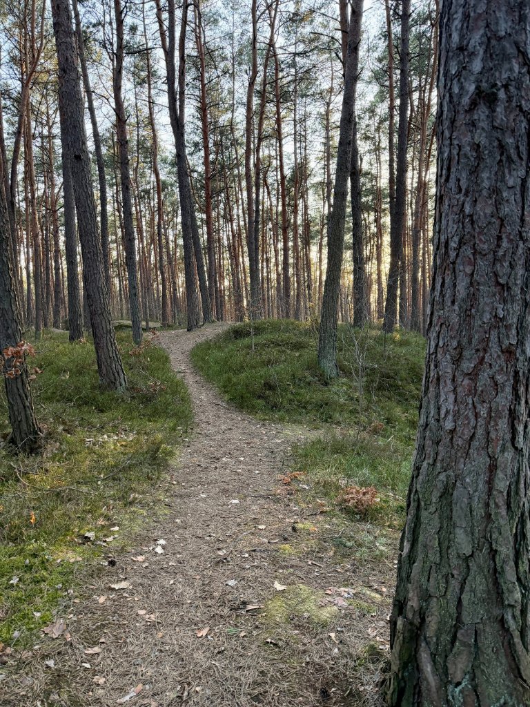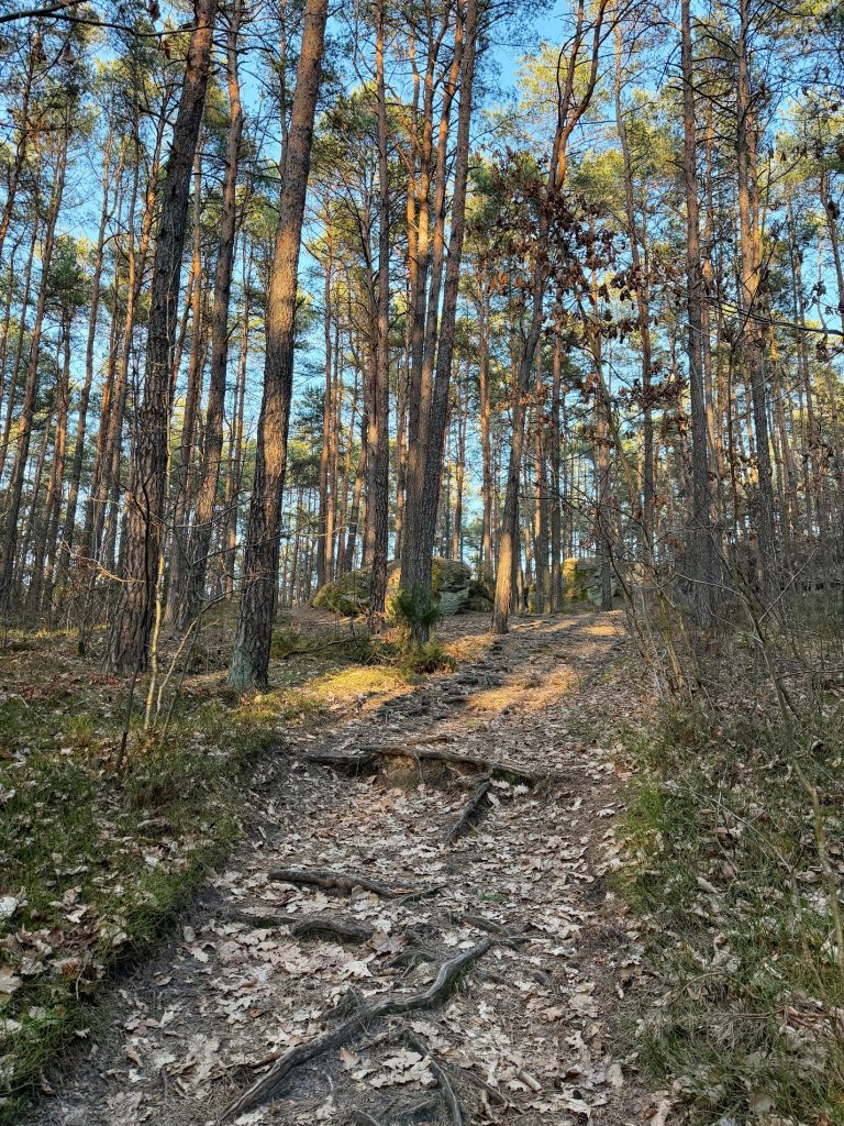 Czerwony szlak prowadzi lekko pod górę przez spokojny, sosnowy, pachnący żywicą las. Ścieżka jest szeroka, miejscami przecinają ją korzenie drzew, a pod nogami miękko skrzypi sucha ściółka. Na ścieżce spotykamy tylko rodzinę z pieskiem i parę spacerowiczów. Droga na skałki okazała się zaskakująco krótka. Słońce było już bardzo nisko i świeciło miękkim, ciepłym światłem. Ten moment dnia, kiedy wszystko robi się trochę bardziej złote i spokojne.