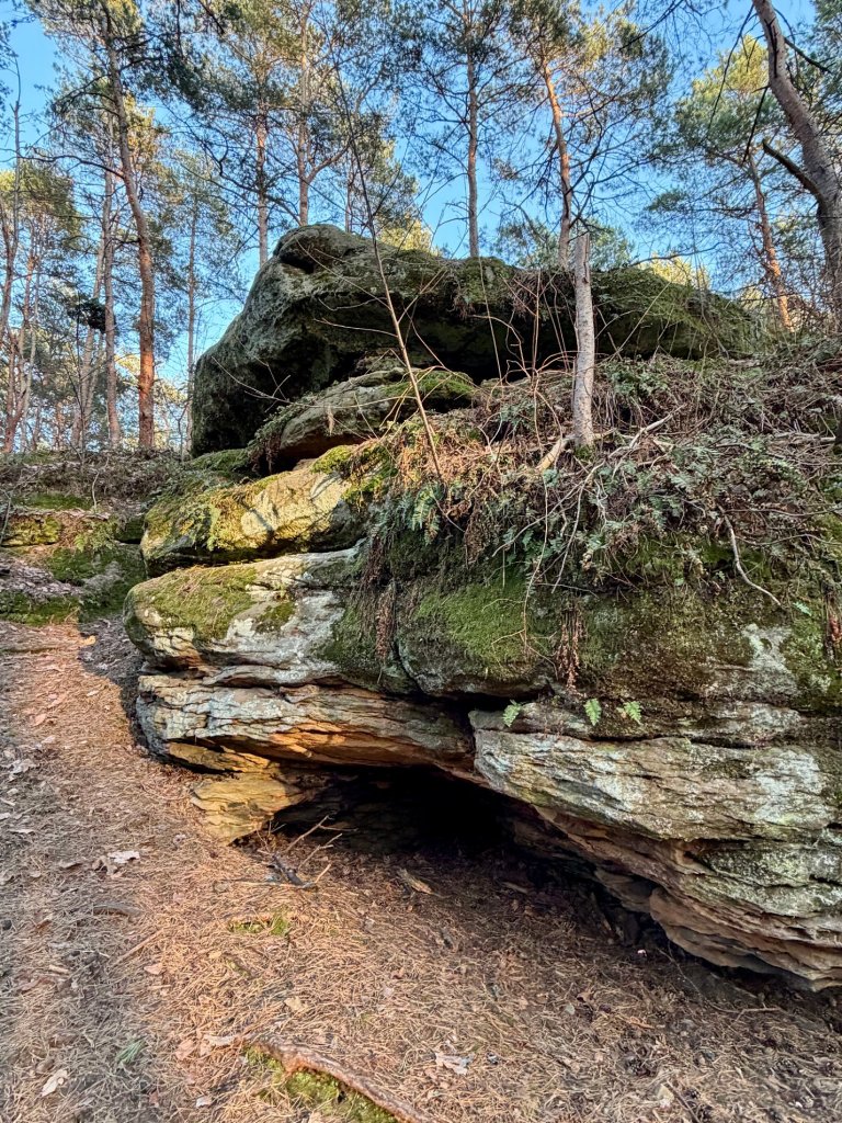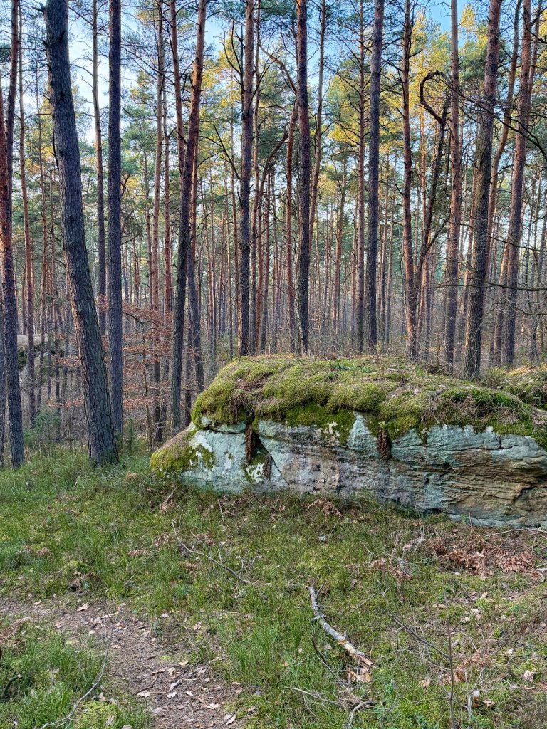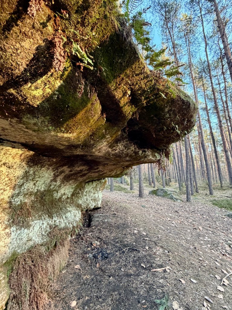 Po kilku minutach marszu między pniami zaczęły pojawiać się pierwsze zarysy skał. Najpierw tylko fragmenty jasnego piaskowca wystające z ziemi, potem coraz większe formacje ukryte między drzewami. Wyglądały trochę jak małe wyspy wyrastające z leśnego podłoża.