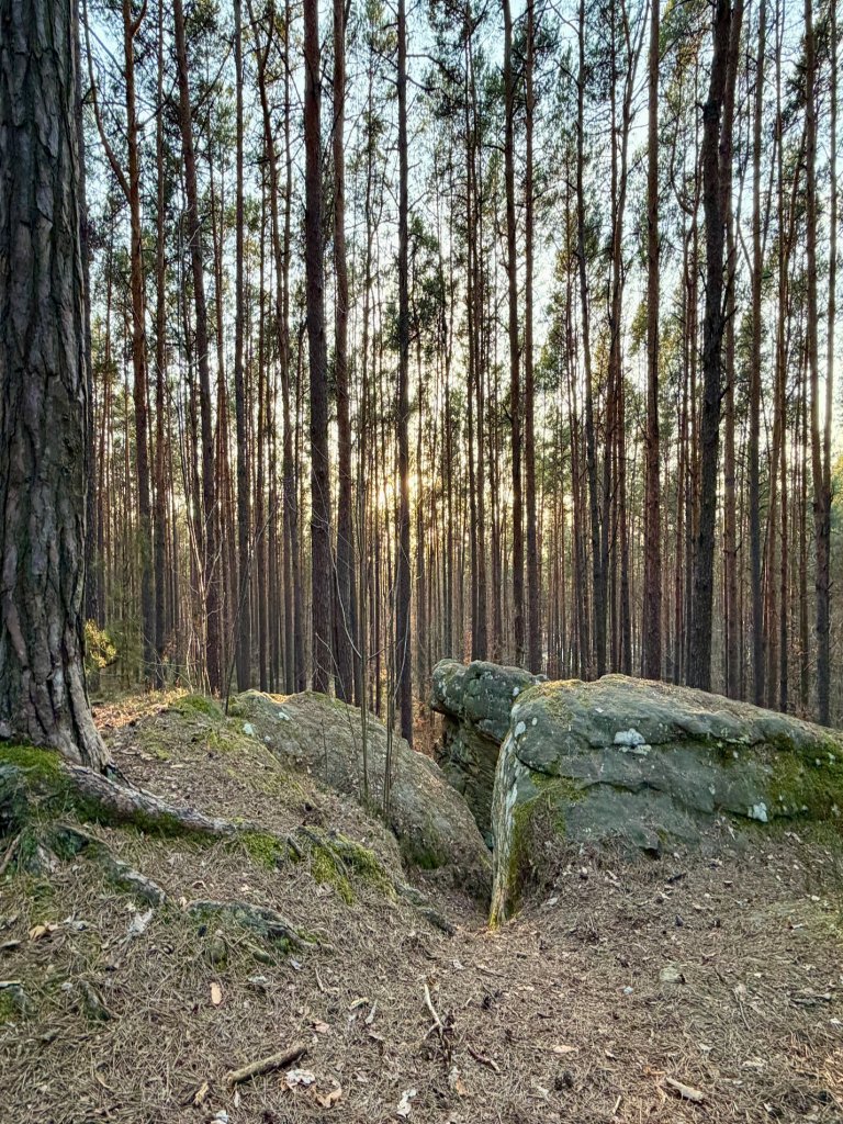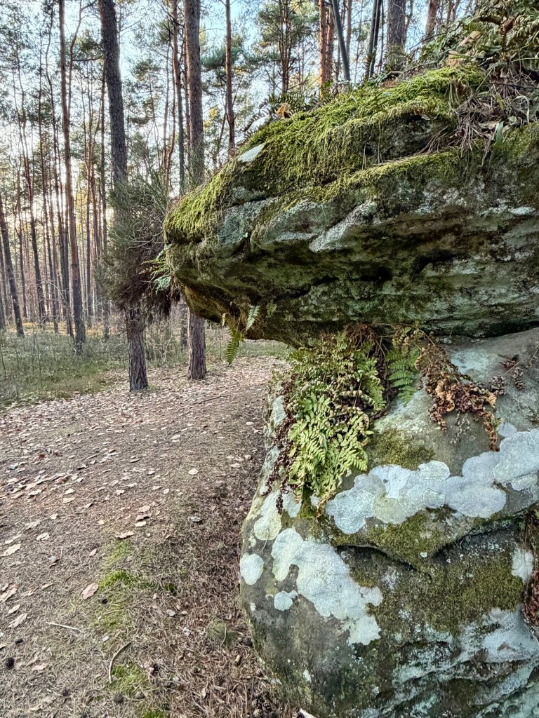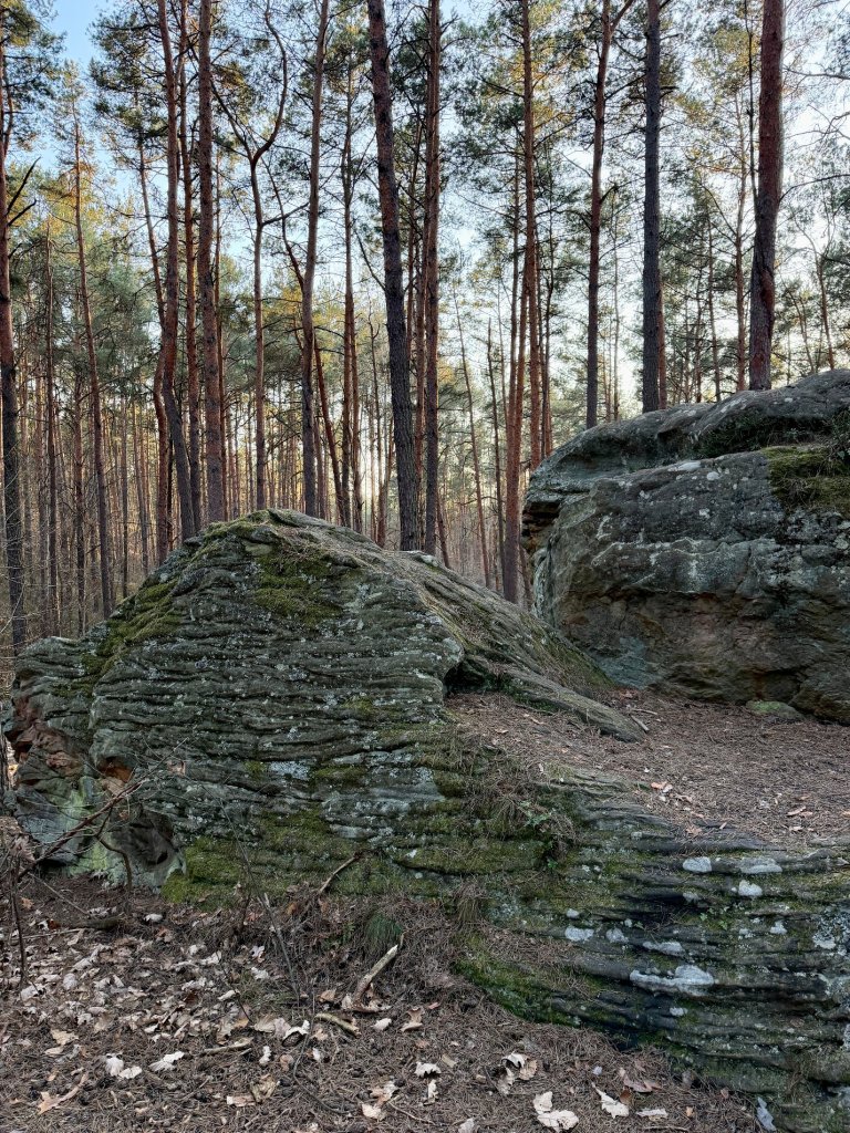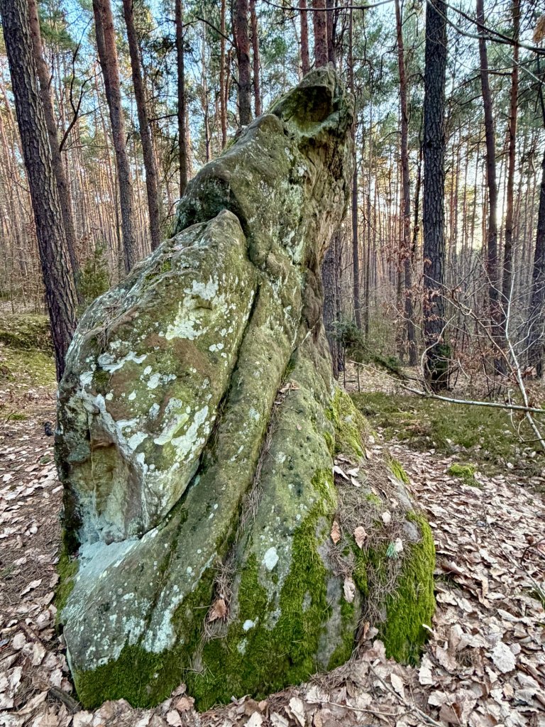 I wtedy wiedzieliśmy już, że to miejsce będzie ciekawsze, niż początkowo zakładaliśmy. Kiedy podeszliśmy bliżej, skał zaczęło pojawiać się coraz więcej. Nie tworzą jednej wysokiej ściany ani spektakularnego kanionu, raczej rozrzucone są po lesie w niewielkich grupach, jakby ktoś poustawiał je między drzewami.
