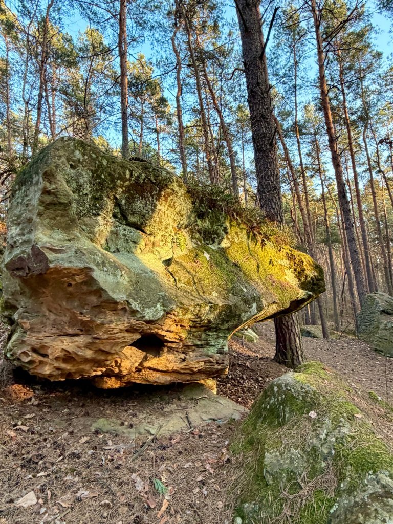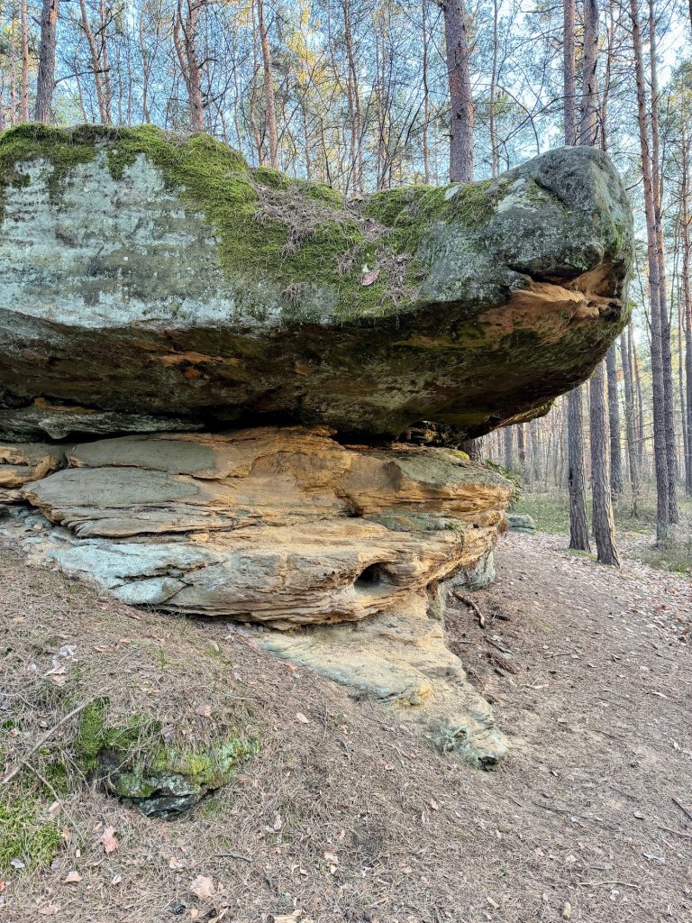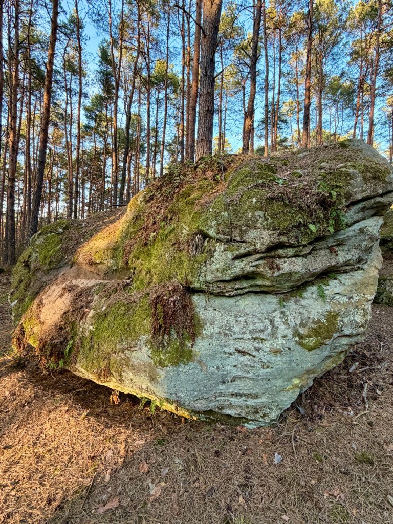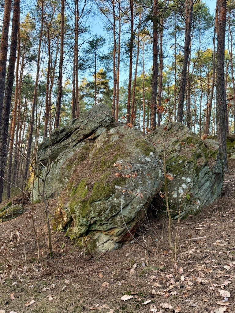 I wtedy wiedzieliśmy już, że to miejsce będzie ciekawsze, niż początkowo zakładaliśmy. Kiedy podeszliśmy bliżej, skał zaczęło pojawiać się coraz więcej. Nie tworzą jednej wysokiej ściany ani spektakularnego kanionu, raczej rozrzucone są po lesie w niewielkich grupach, jakby ktoś poustawiał je między drzewami.