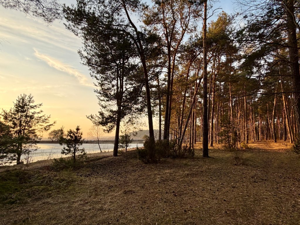 Po dłuższym krążeniu między skałami zaczęliśmy powoli wracać w stronę zalewu. Słońce było już bardzo nisko i światło zaczęło robić się coraz cieplejsze. Las powoli ciemniał, a między drzewami pojawiały się długie cienie. Ścieżka prowadziła nas z powrotem w stronę wody. Po kilku minutach znowu zobaczyliśmy plażę i spokojną taflę zalewu.