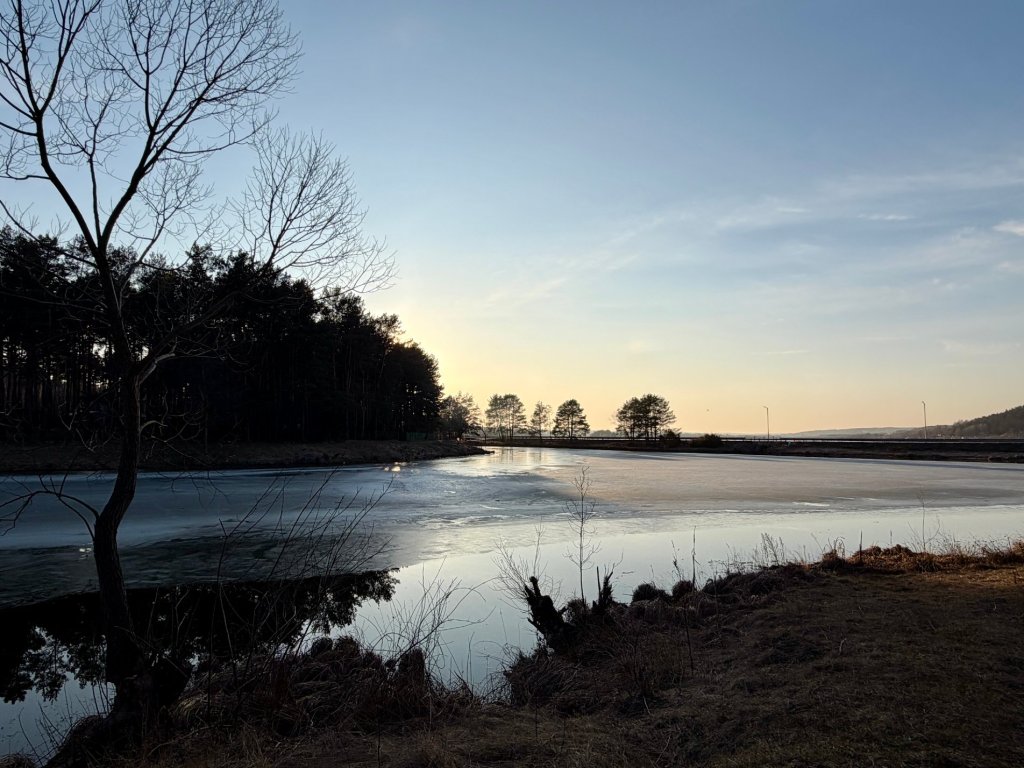 I wtedy stwierdziliśmy, że jeszcze chwilę tu zostaniemy. Usiedliśmy na brzegu i po prostu patrzyliśmy, jak dzień powoli się kończy. Na wodzie widać było cienką warstwę lodu, która odbijała kolory zachodzącego słońca.
