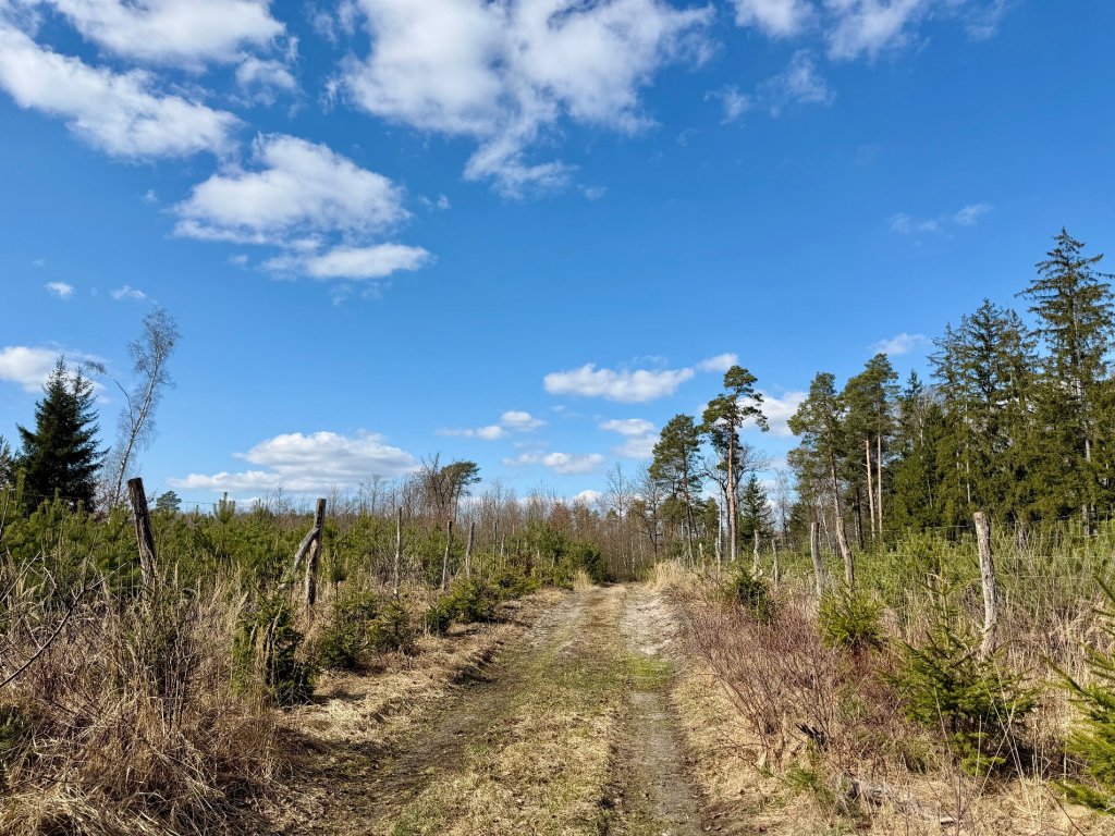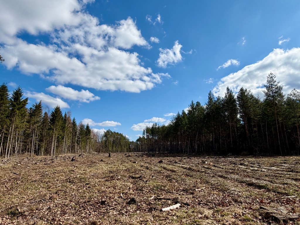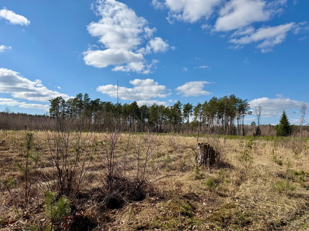 Dalej teren się otwiera. Drzew jest mniej, światła więcej. Widać fragmenty po wycince – przestrzeń przestaje być zamknięta, robi się bardziej surowa, mniej „warstwowa” niż ta z tabliczki. Wiatr znów daje o sobie znać. Słychać go w koronach drzew i w tej bardziej otwartej przestrzeni brzmi trochę inaczej, mocniej.