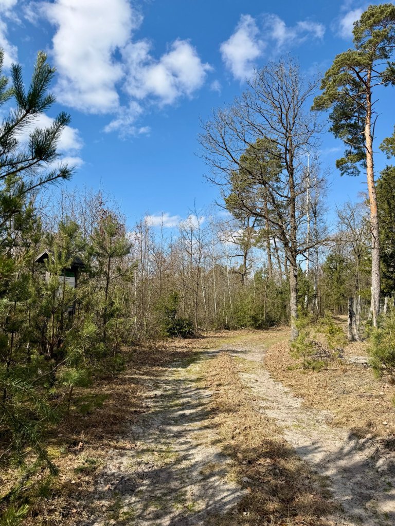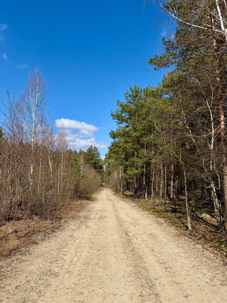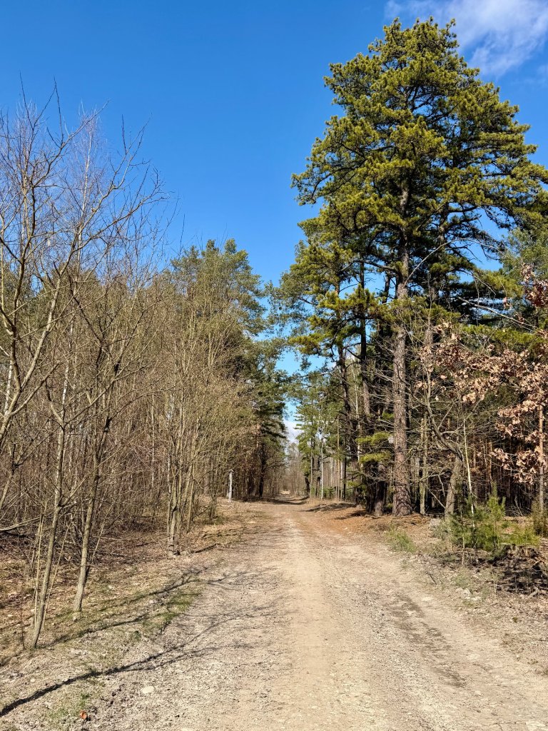 Po kilku krokach wchodzimy na szeroką, piaszczystą drogę. Idzie się lekko, bez wysiłku, a słońce przebija się między drzewami i rozjaśnia całą przestrzeń. Na chwilę robi się prawie wiosennie, choć chłodny wiatr szybko przypomina, że to jeszcze nie ten moment. Najbardziej cieszą nas dźwięki, ptaki są wszędzie, głośne i wyraźne, momentami aż dominujące.