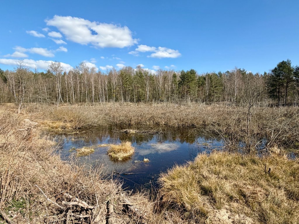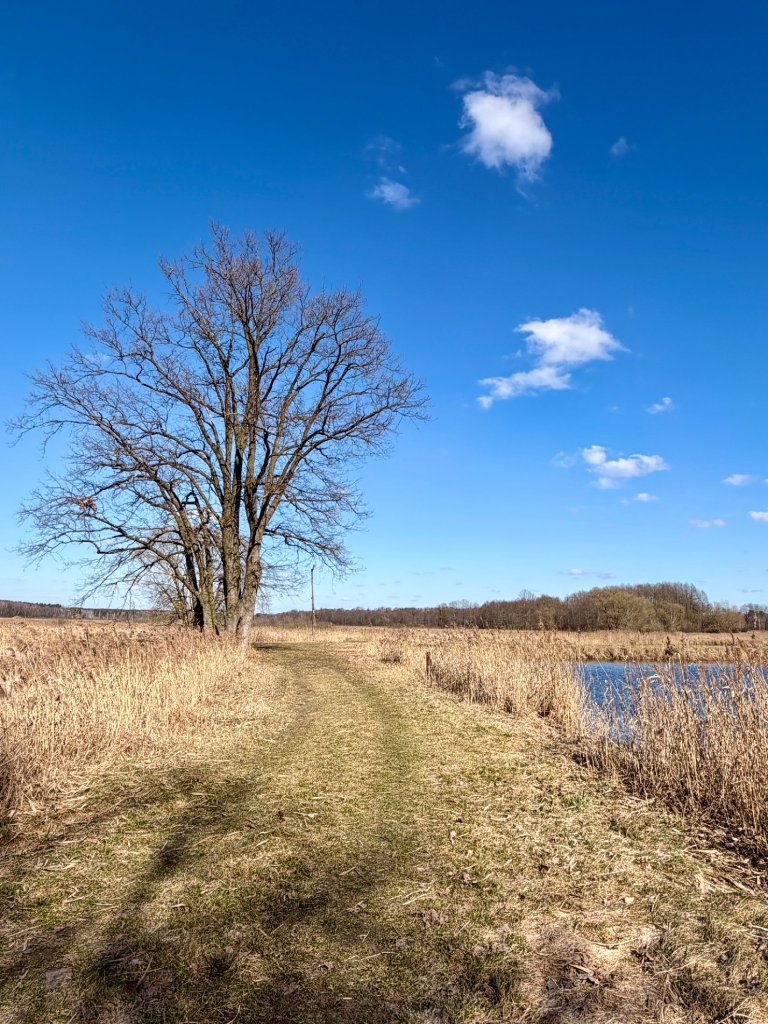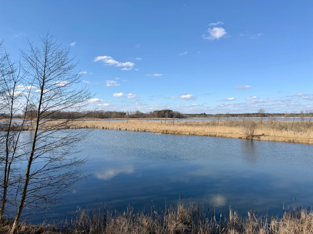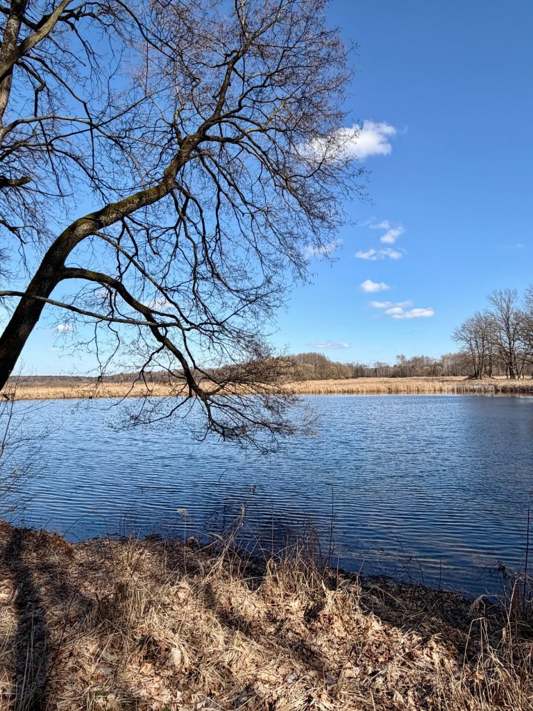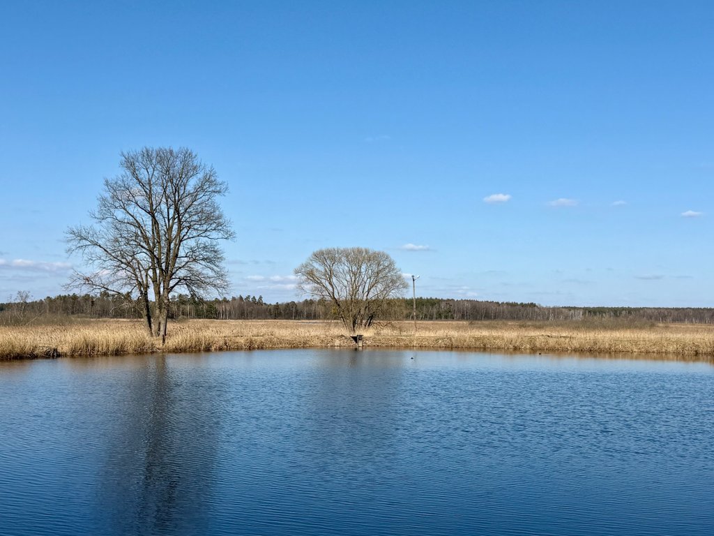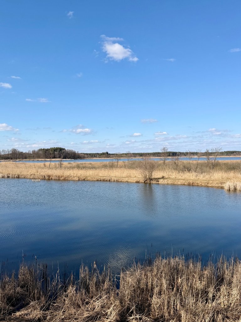 I nagle jest ono. Rozlewisko. Niewielkie, spokojne, otoczone suchą roślinnością. Woda odbija niebo, intensywnie niebieskie, z chmurami, które wydają się jeszcze jaśniejsze w tej tafli.