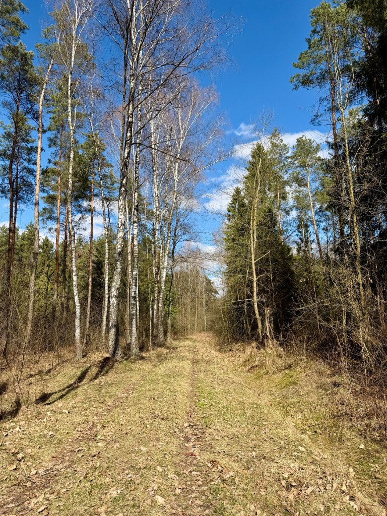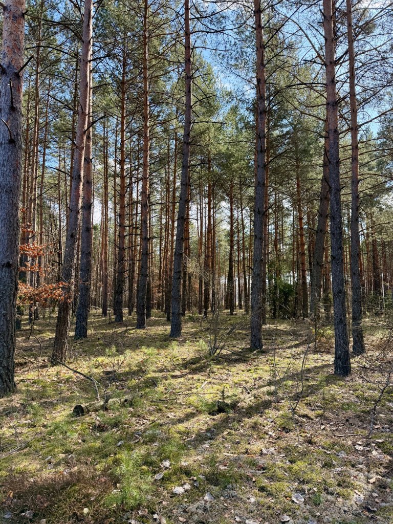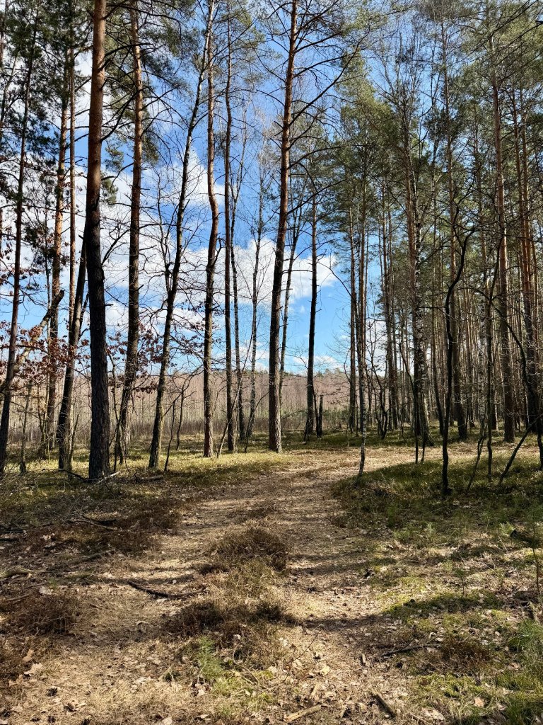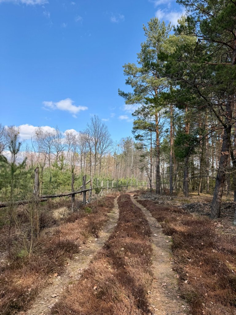 Pod nogami mamy suchą ziemię, miejscami igliwie, gdzieniegdzie mech. Nic nie zdradza tego, co dzieje się pod spodem. Idziemy dalej tą szeroką drogą, w słońcu i wietrze, trochę między młodymi nasadzeniami, trochę między starszymi drzewami. Las wygląda tu inaczej niż wcześniej, bardziej otwarty, mniej „gęsty”, jakby dopiero się układał na nowo.