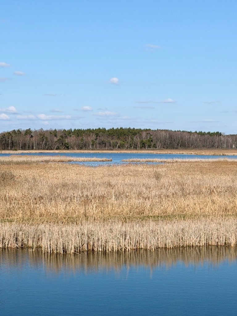 Wchodzimy na wieżę widokową. Z góry widać jeszcze więcej, układ stawów, pasy trzcin i wodę, która odbija niebo tak intensywnie, że trudno oderwać wzrok.